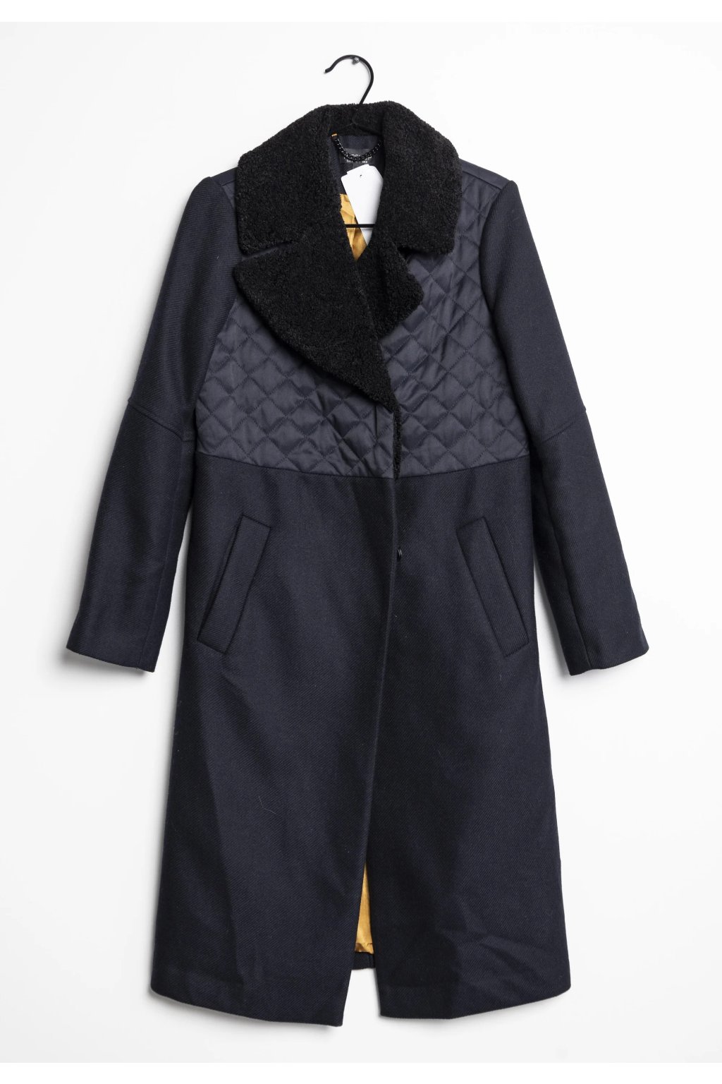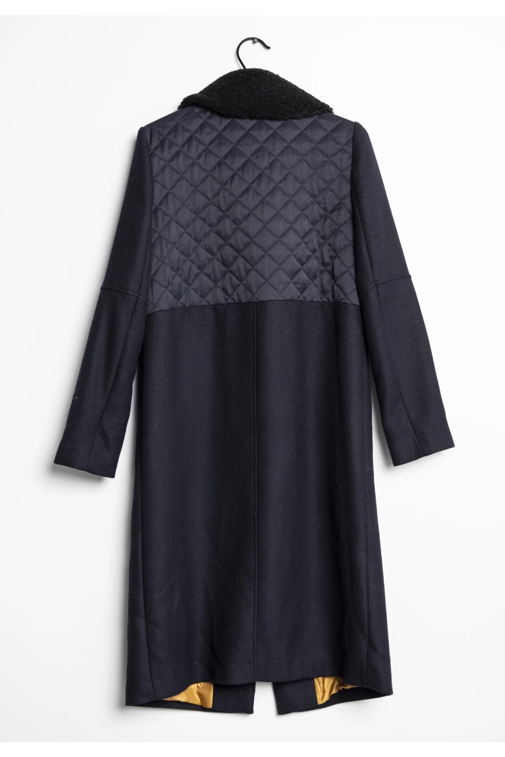 Kabát má tmavě modrou barvu s výrazným kontrastem díky zlaté vnitřní podšívce. Horní část kabátu je elegantně prošívaná, což vytváří moderní vzhled a zároveň zvyšuje tepelný komfort. Měkký kožíškový límec přidává na útulnosti a stylu. Skryté zapínání a dvě šikmé kapsy podtrhují čistý vzhled. Díky rovnému, lehce volnějšímu střihu se pohodlně nosí i přes silnější svetry.