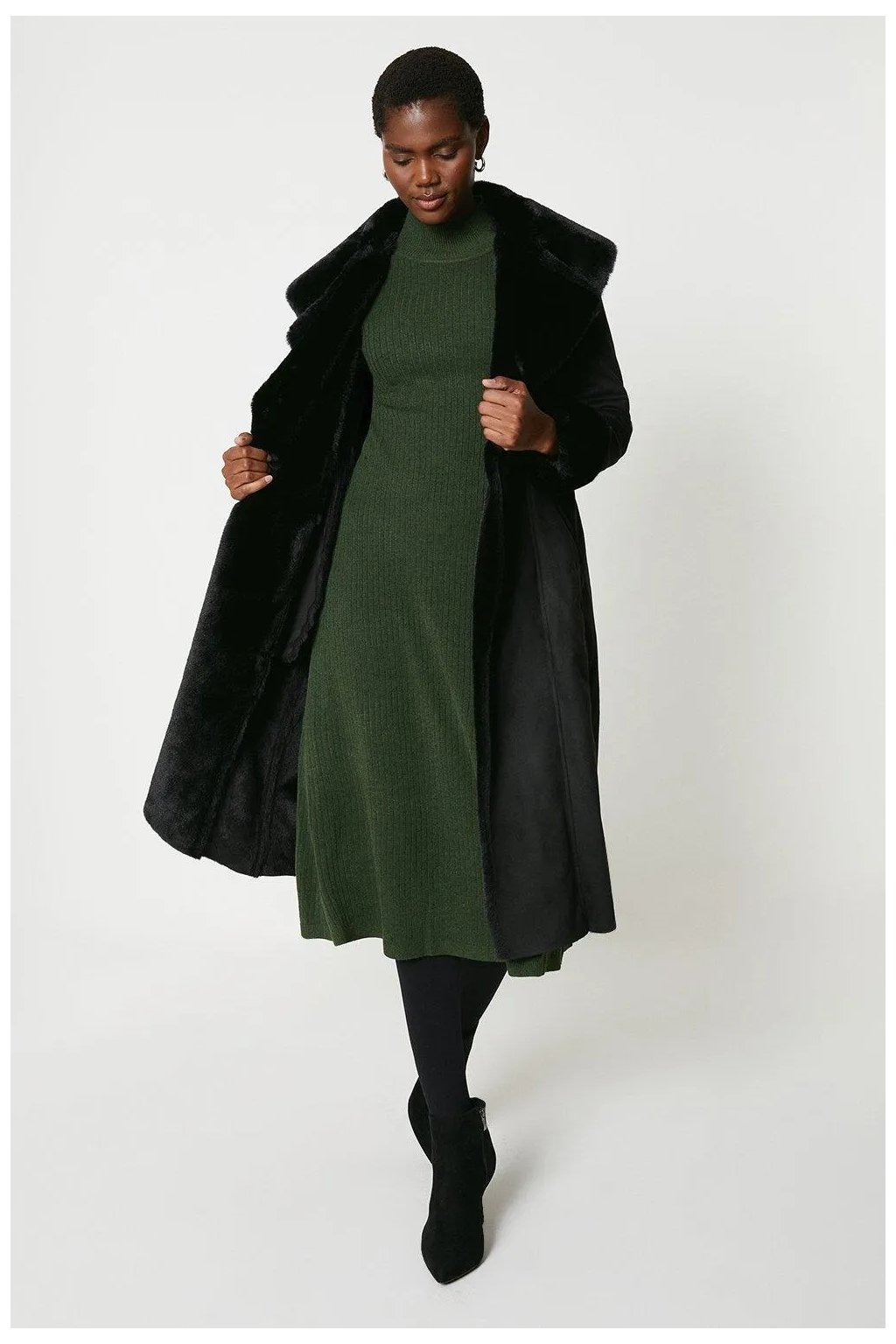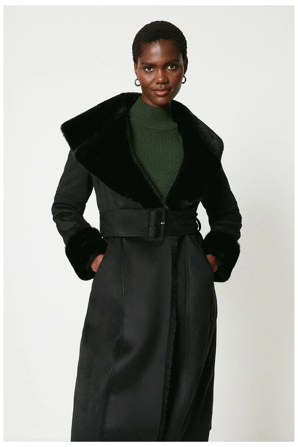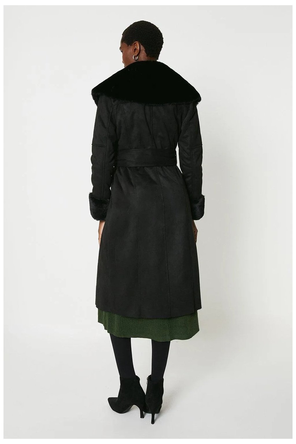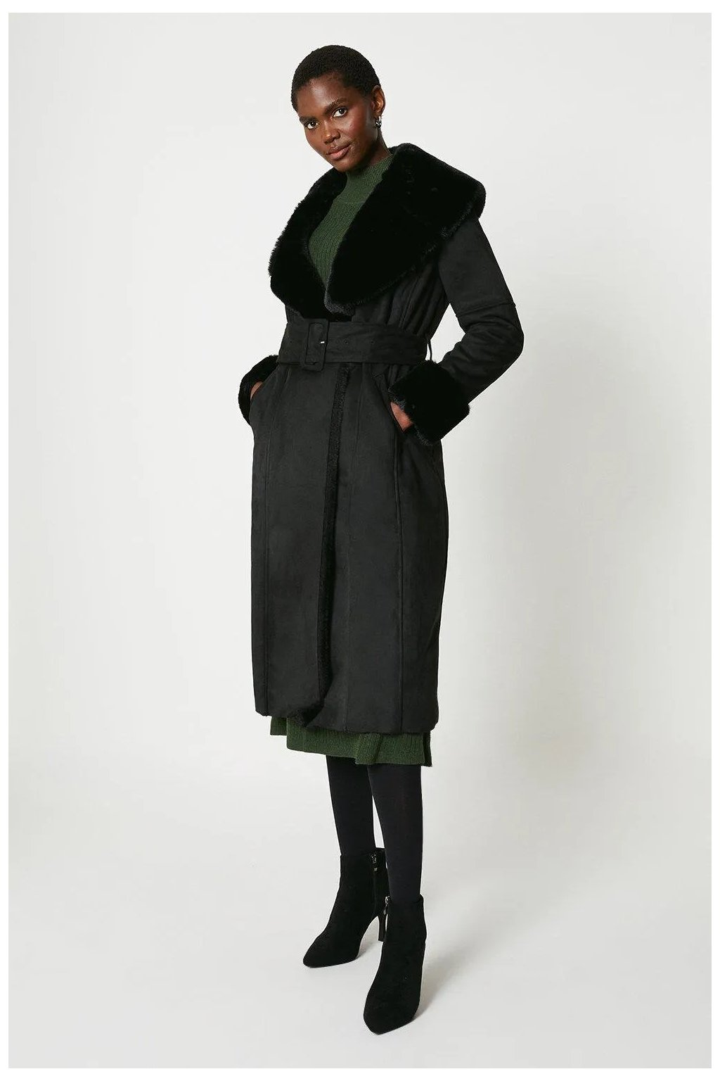 Wallis – Dlouhý kabát s páskem a kožíškovým límcem (Faux Shearling)