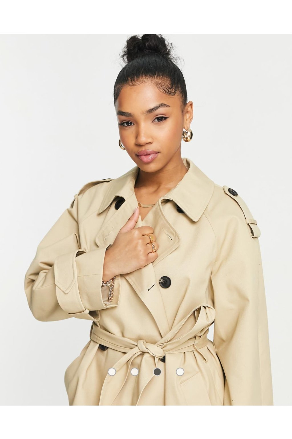 Klasický dvouřadý střih s výraznými černými knoflíky, opaskem na zavazování v pase a typickými detaily jako jsou ramenní patky nebo klopa na zádech, dodává kabátu autentický trench coat vzhled. Lehký, ale pevný materiál dobře drží tvar a poskytuje příjemné pohodlí při nošení.