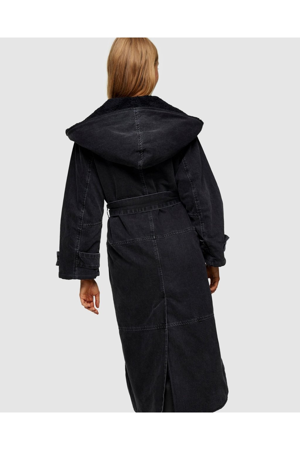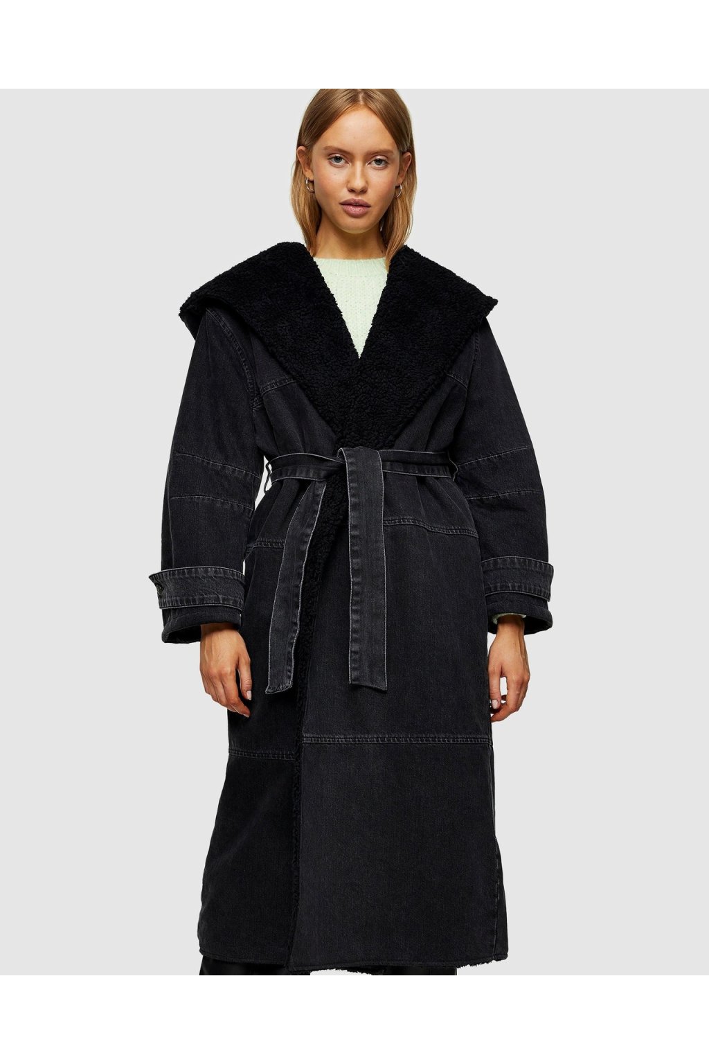Stylový a teplý kabát z kolekce TOPSHOP je perfektní volbou pro chladné dny. Tento dlouhý černý kabát kombinuje ležérní denimový vzhled s útulným borg (kožíškovým) límcem a vnitřní podšívkou. Oversize střih a pásek v pase dodávají moderní siluetu, zatímco kontrastní švy podtrhují celkový design.