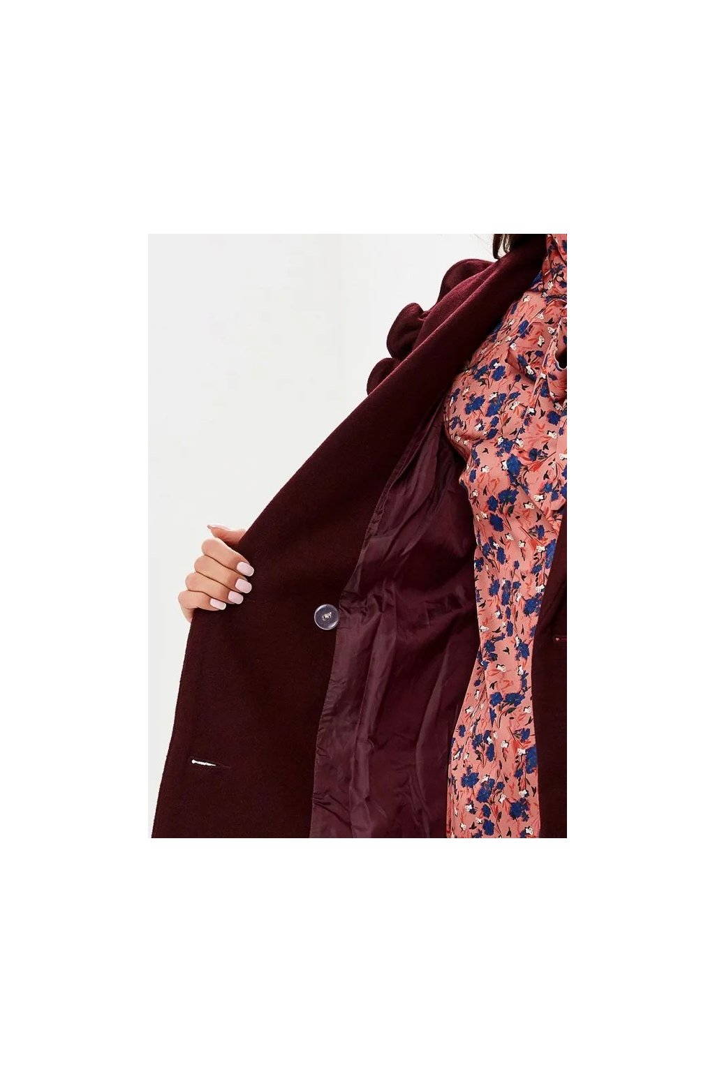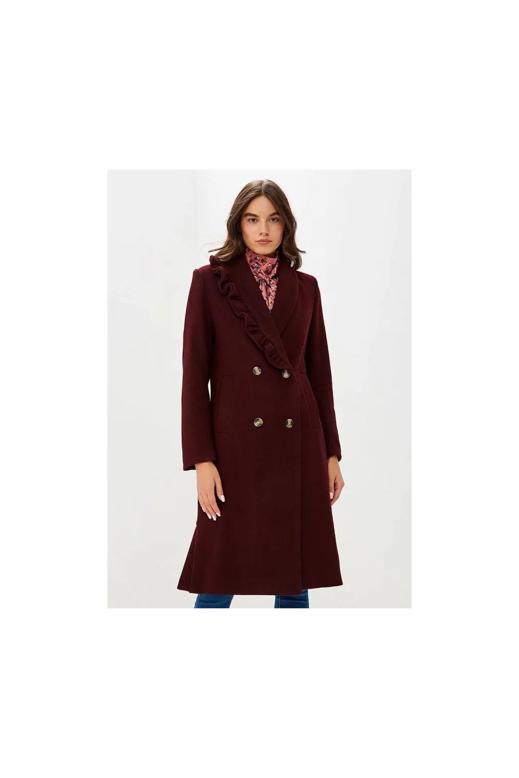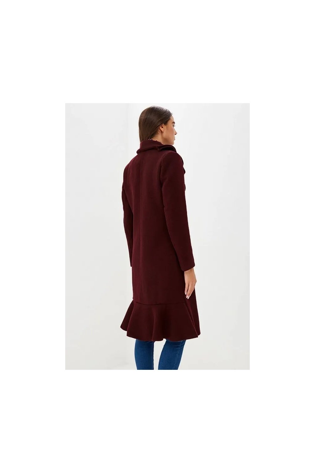 Kabát je vyroben z pevného textilu s atlasovou podšívkou. Model má rovný střih, rozšířený směrem dolů. Detaily: límec s klopami, dvouřadé zapínání na knoflíky, dvě vsazené boční kapsy, asymetrická volánová ozdoba na límci.