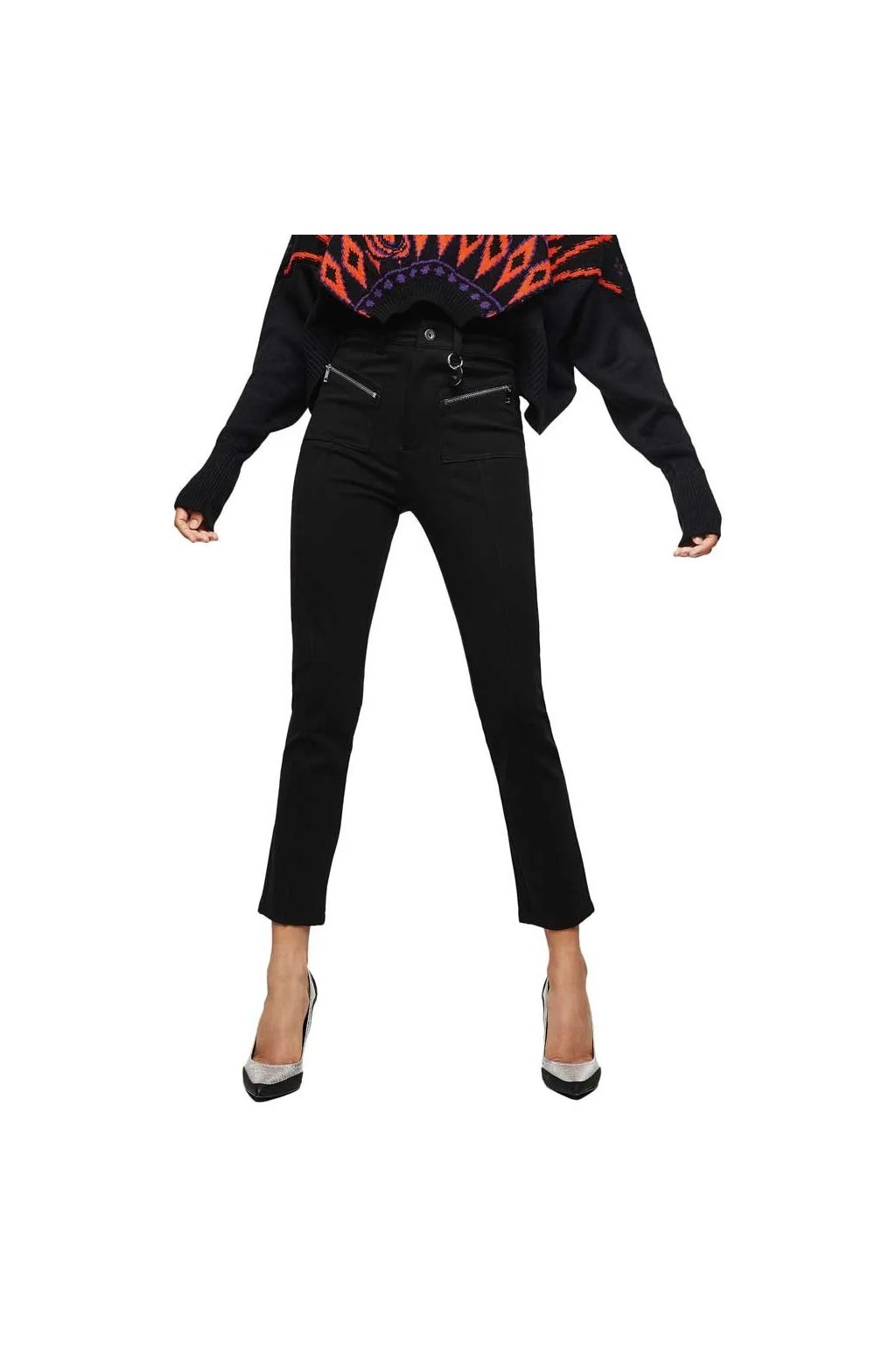Tyto motorkářské kalhoty jsou ušity z pružného úpletu Milano s panely pro strukturovaný vzhled. Mají úzký (skinny) střih a zdobí je stříbrné zipy na kapsách a na koncích nohavic. Odnímatelná klíčenka s logem zvýrazňuje pas a dodává kalhotám výrazný detail.