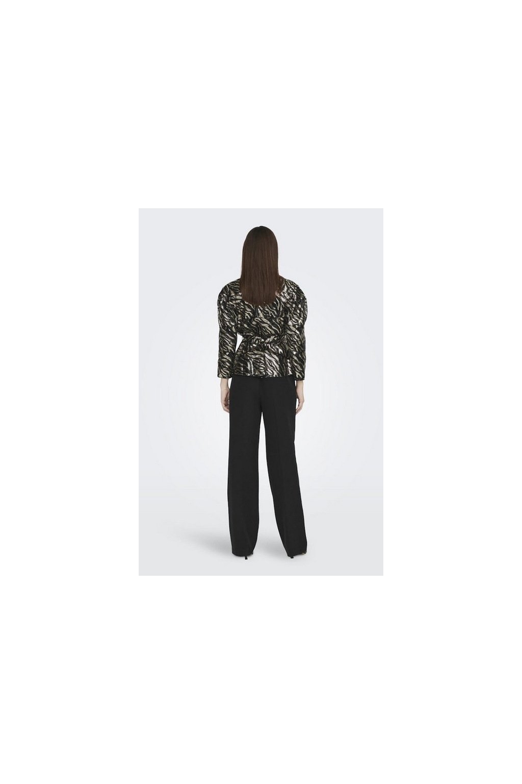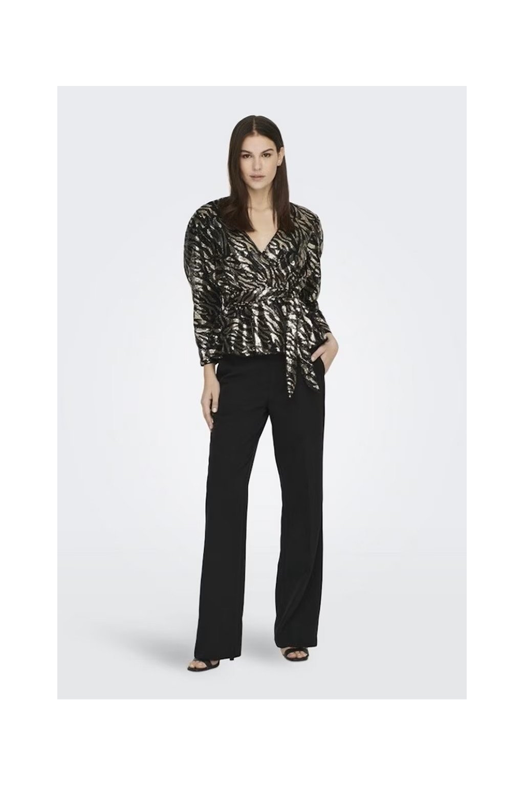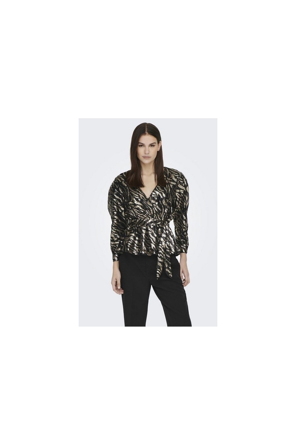 Elegantní halenka La Strada v zlaté a černé barvě je ideální volbou pro večerní události nebo speciální příležitosti. Tento model s výrazným metalickým povrchem a zvířecím vzorem přitahuje pozornost a zajišťuje sofistikovaný vzhled. Halenka s volnějším střihem, dekoltem do V a zavazováním v pase vytváří štíhlou siluetu a pohodlné nošení. S dlouhými rukávy a jemným rozšířením ve spodní části dodává šmrnc a eleganci. Skvěle se kombinuje s černými kalhotami nebo elegantní sukní pro dokonale stylový outfit.