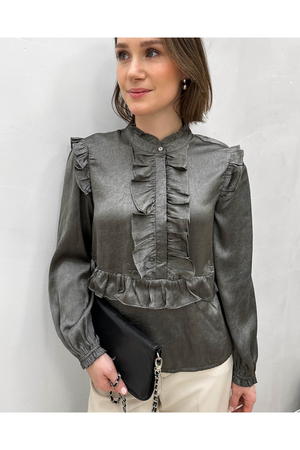 Elegantní a výrazná halenka z kolekce ONLY v odstínu Thunderstorm (tmavě šedá s metalickým nádechem). Zaujme svým jedinečným lesklým efektem a bohatými volány na přední straně, ramenou i pase, které dodávají romantický a sofistikovaný vzhled.