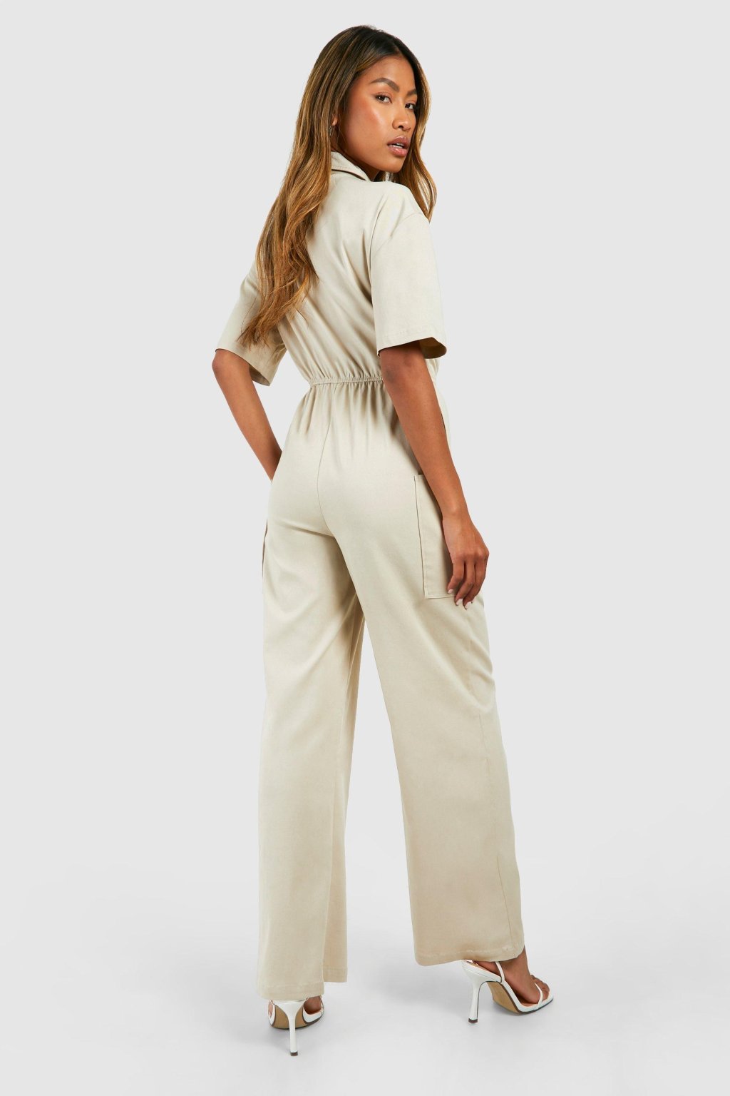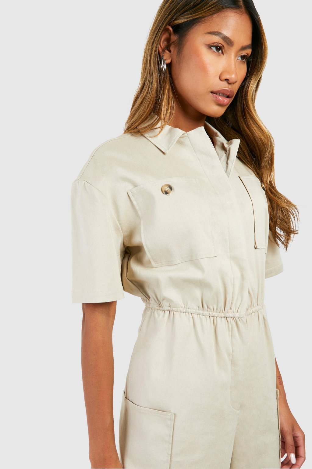 Zvýrazněte svůj každodenní styl s tímto stylovým a praktickým cargo overalem od Boohoo. Vyrobený z měkké látky v kamenně béžové barvě, tento overal v utility stylu kombinuje pohodlí a moderní vzhled. Má krátké rukávy, klasický límec a náprsní kapsy na knoflíky, které dodávají elegantní a zároveň funkční vzhled.