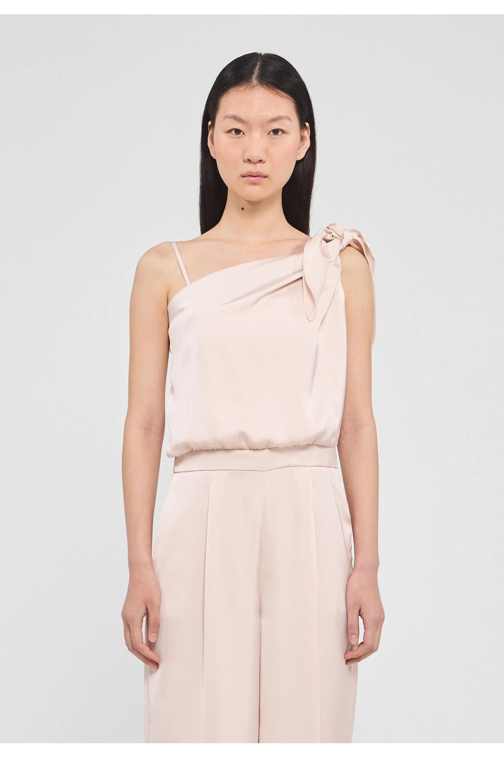 Asymetrický jednoramenní střih s jemným uzlem na rameni
