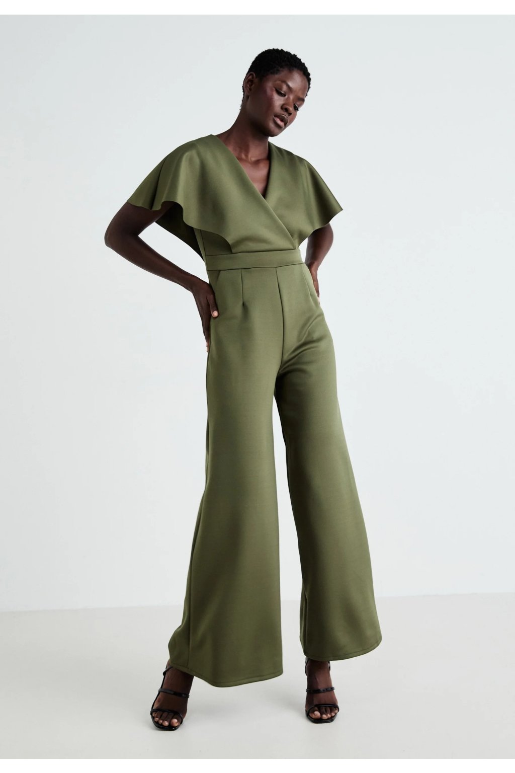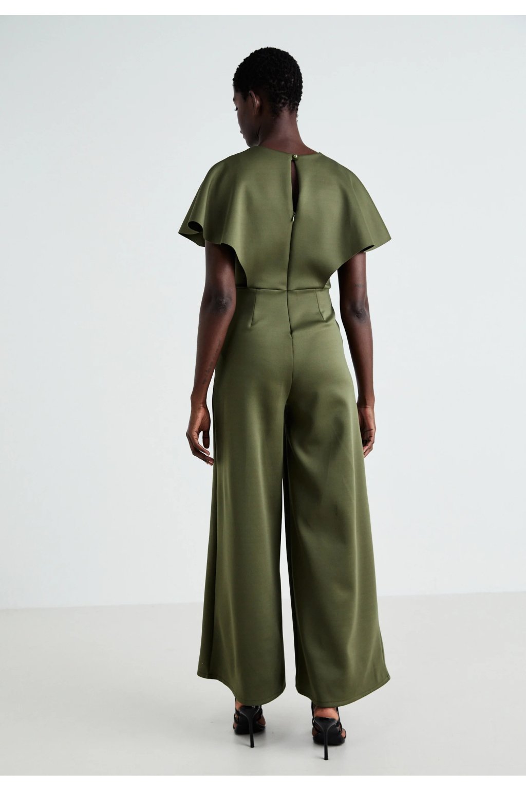 Tento elegantní overal WEDDING BETTY WRAP WAL G. v tmavě khaki barvě je ideální volbou pro sofistikované události, jako jsou svatby, večírky nebo jiné formální příležitosti. Overal se vyznačuje jedinečným zavinovacím designem v oblasti dekoltu a krásnými volnými rukávy, které mu dodávají ženský a vzdušný vzhled. Kalhoty s širokými nohavicemi dokonale ladí s celkovým stylovým a moderním vzhledem.