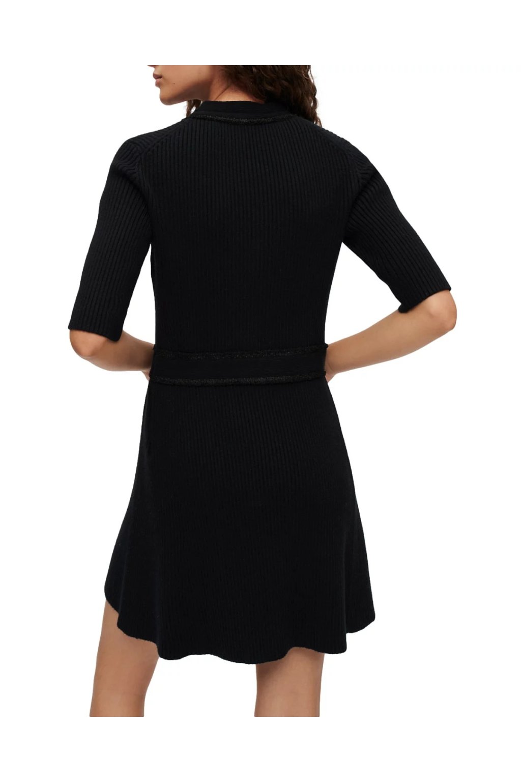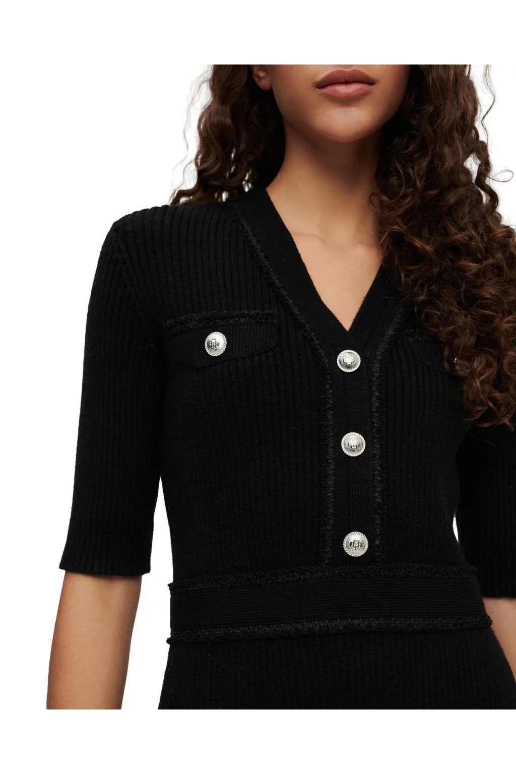 Tyto elegantní a moderní mini šaty značky Maje v černé barvě jsou vyrobeny z kvalitní žebrované pleteniny, která zajišťuje pohodlný a elastický fit. Šaty mají V-krční výstřih, který je zdobený jemným pleteným detailem, a zapínání na velké stříbrné knoflíky, které dodávají modelu sofistikovaný vzhled. Na přední straně jsou umístěny dvě kapsy s klopami a knoflíky, což přidává šatům na praktičnosti i stylu. Klasický střih s mírně rozšířeným spodním lemem dává šatům trendy vzhled, který je zároveň pohodlný pro každodenní nošení.