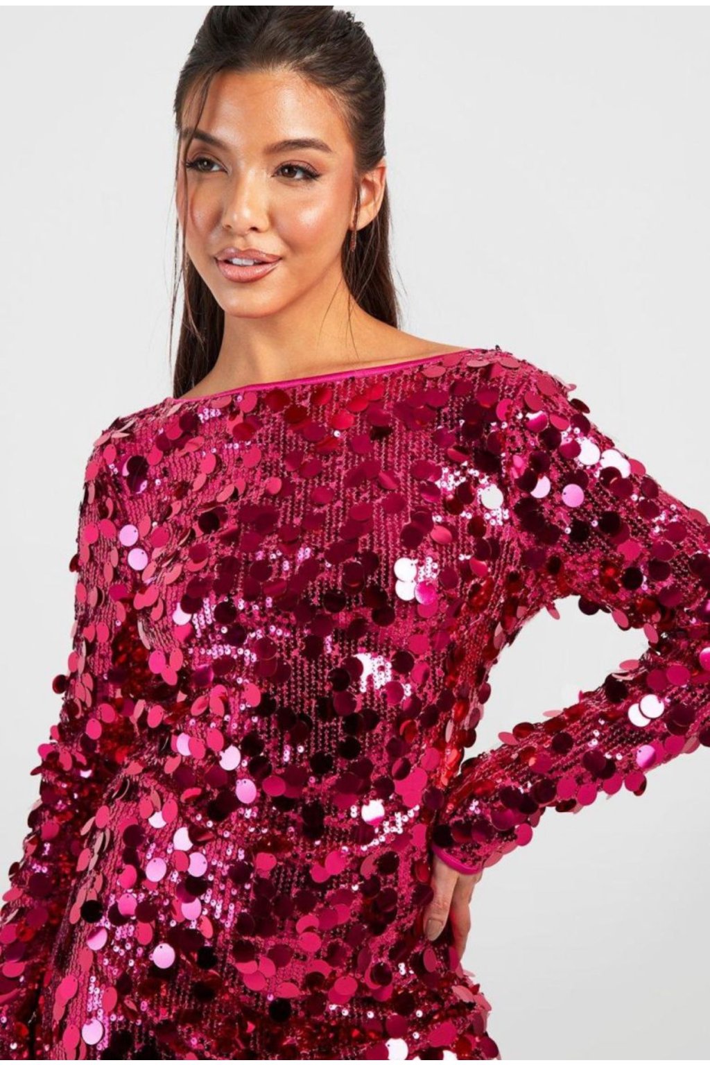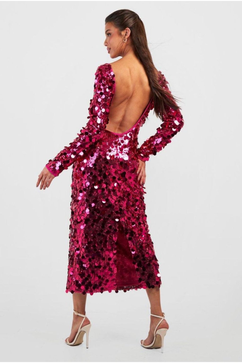 Zažehněte večírek ve velkém stylu! Tyto výrazné růžové midaxi šaty od značky Boohoo jsou opravdovým magnetem na pohledy. Celý model je posetý velkými lesklými flitry, které odrážejí světlo při každém pohybu. Šaty mají dlouhé rukávy, lichotivý rovný výstřih a naprosto ohromující hluboký výstřih na zádech, který dodává outfitu smyslnost a šmrnc.