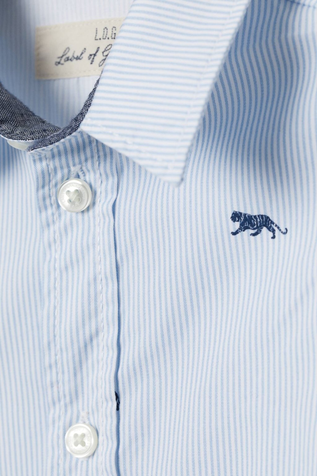 Stylová košile pro malé objevitele! Tato dětská košile z kolekce H&M L.O.G.G. je vyrobena z měkké a prodyšné bavlny, ideální pro každodenní nošení i speciální příležitosti. Světle modré tenké proužky doplňují výšivky safari zvířat (tygr, žirafa, slon a další), které dodávají košili hravý a originální vzhled.