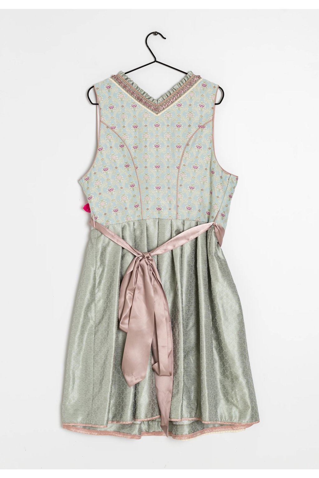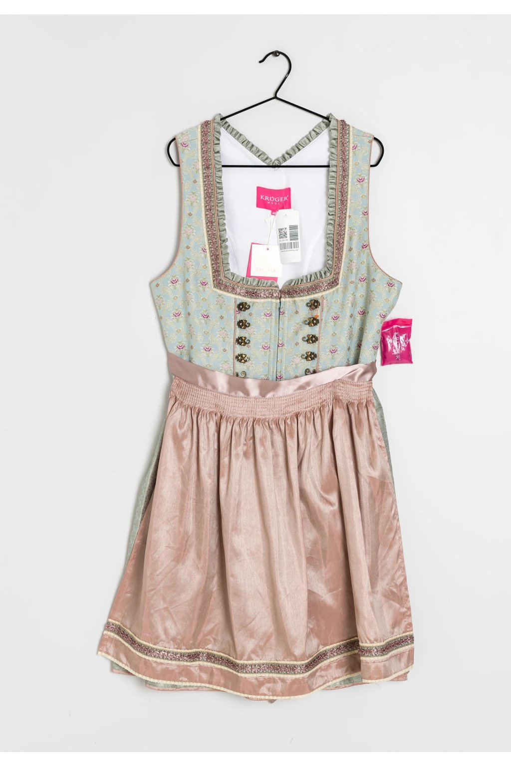 Tento nádherný dirndl od značky Krüger Madl v jemně zeleném odstínu je ztělesněním ženskosti a tradiční elegance s moderním nádechem. Bohaté zdobení, saténová mašle a krajkový živůtek z něj dělají ideální model pro slavnostní příležitosti jako Oktoberfest, svatby nebo folklórní večery.