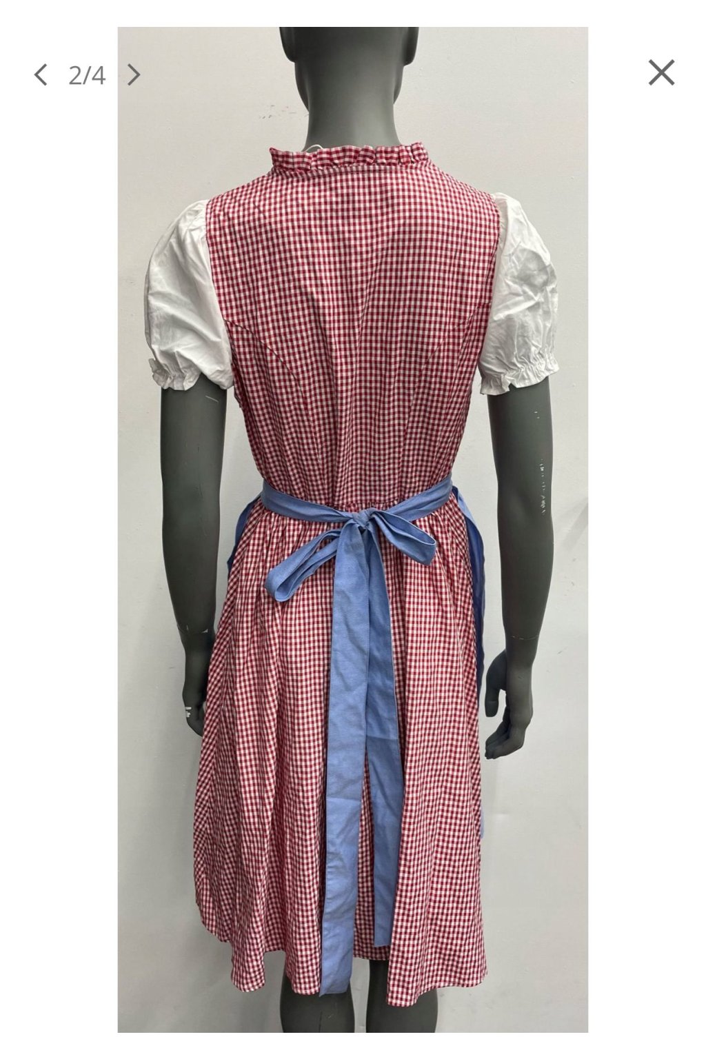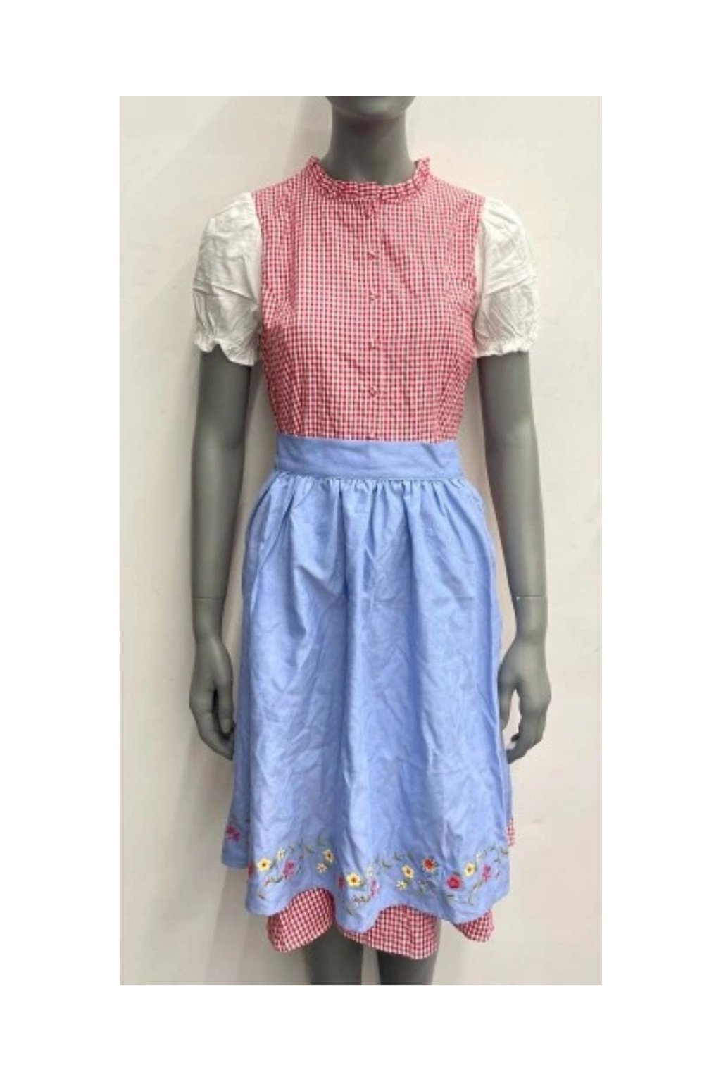 Tradiční bavorský dirndl v něžném a zároveň veselém provedení. Tento model v kombinaci červenobílé kostky a modré zástěry s květinovou výšivkou je ideální volbou na Oktoberfest, folklorní slavnosti nebo jiné tematické akce.