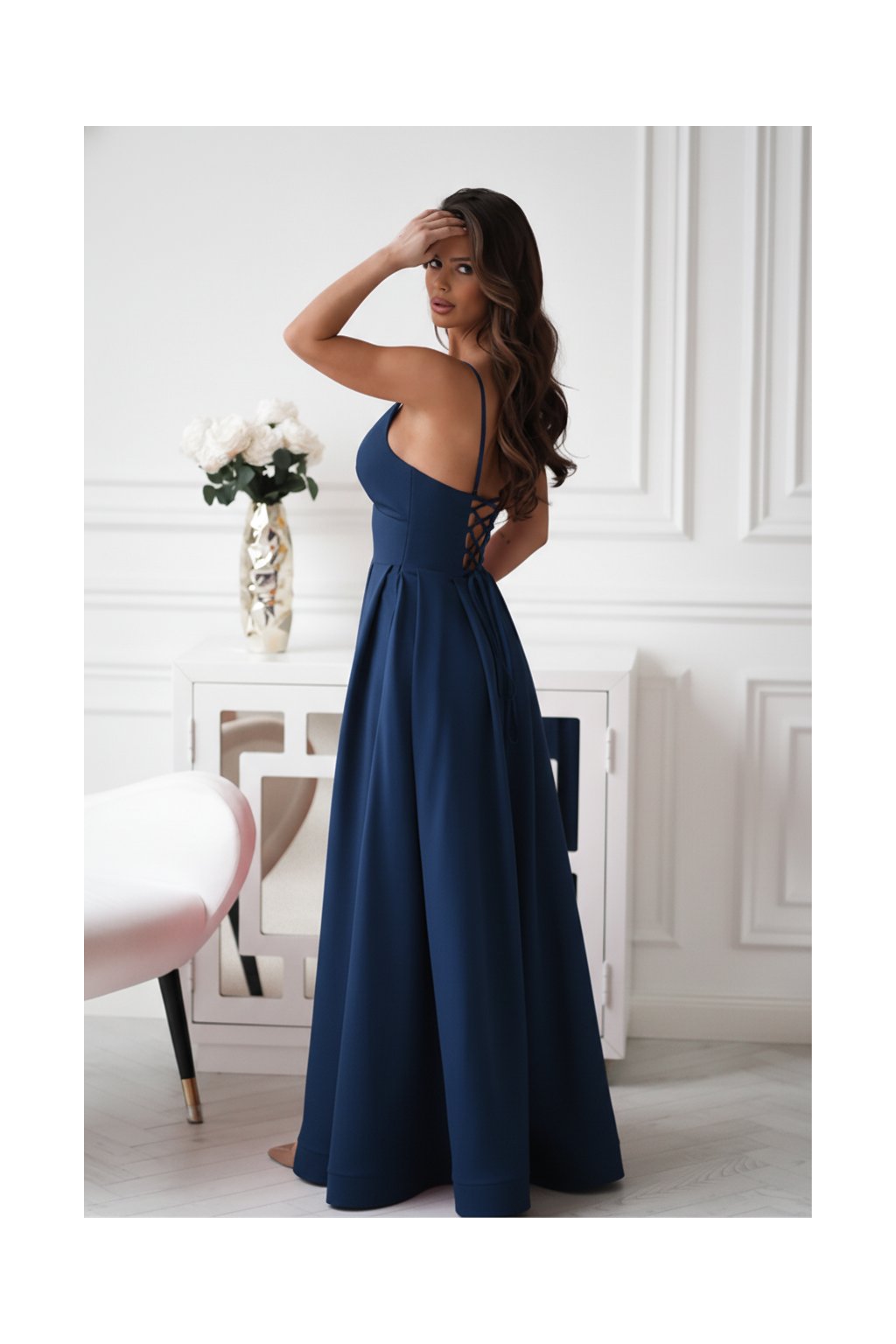 Elegantní dlouhé šaty s jemně projmutým živůtkem a splývavou sukní. Hlubší výstřih a vysoký rozparek dodávají modelu ženskost a lehkou smyslnost. Ideální volba pro plesy, svatby i slavnostní večery.
