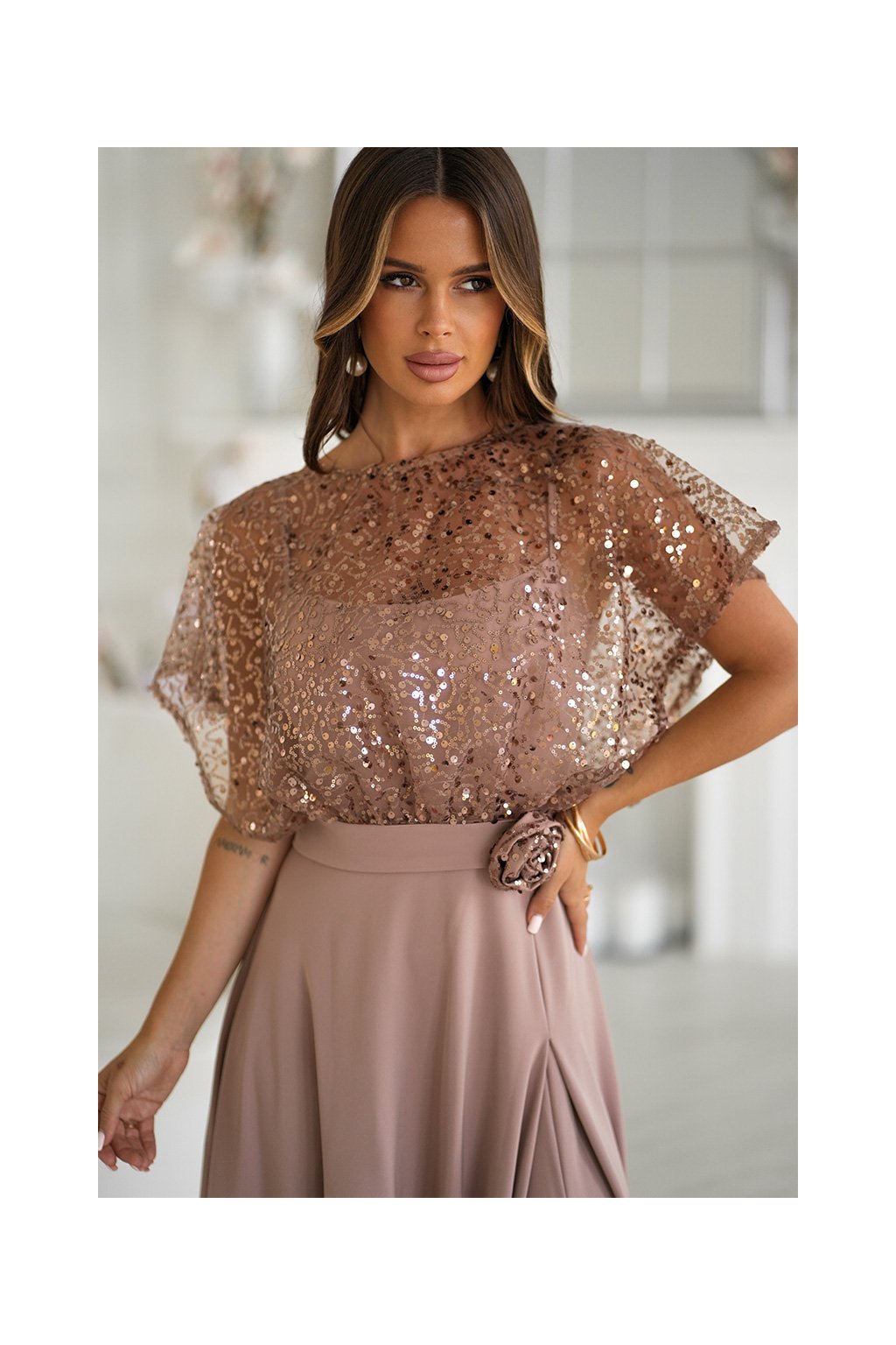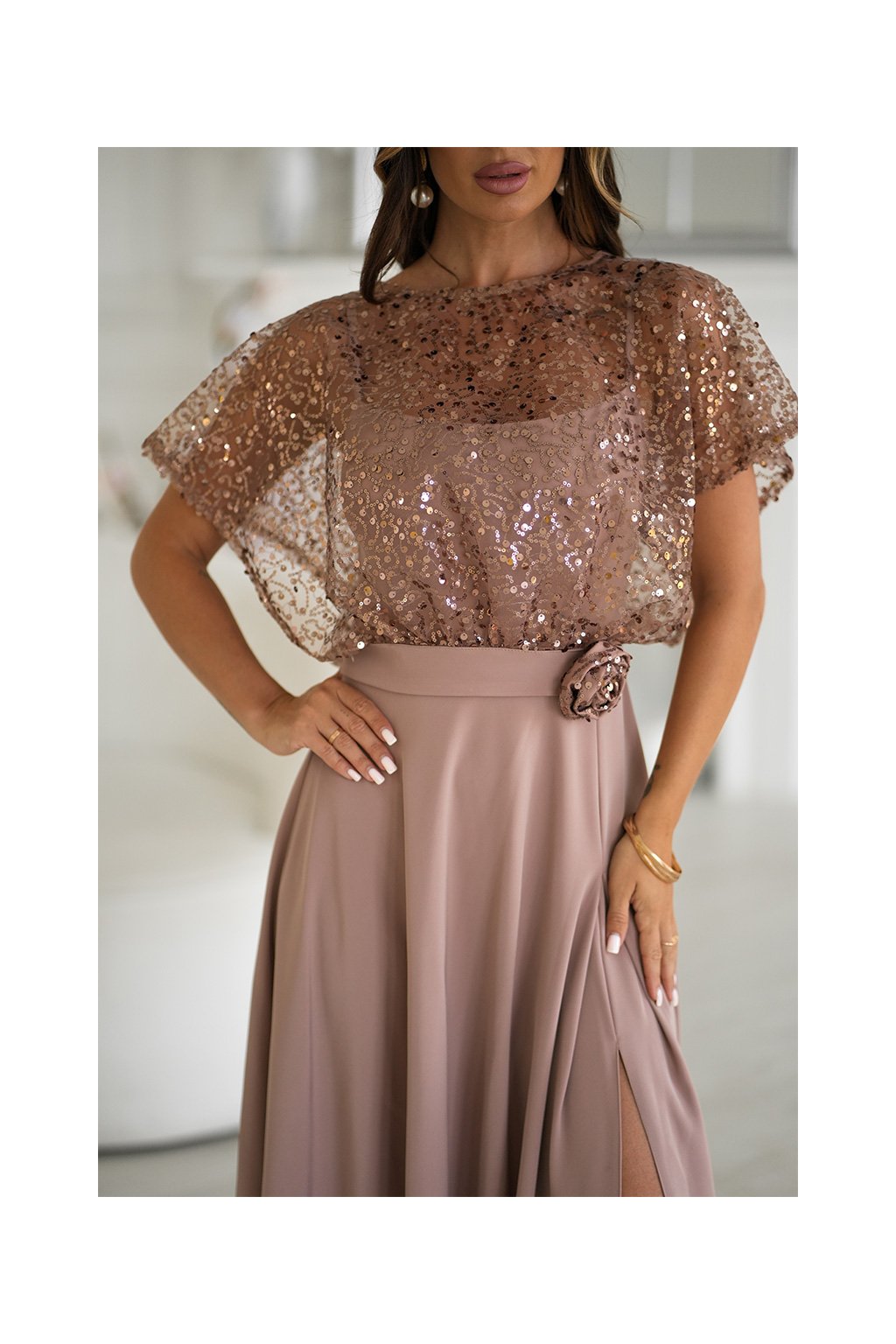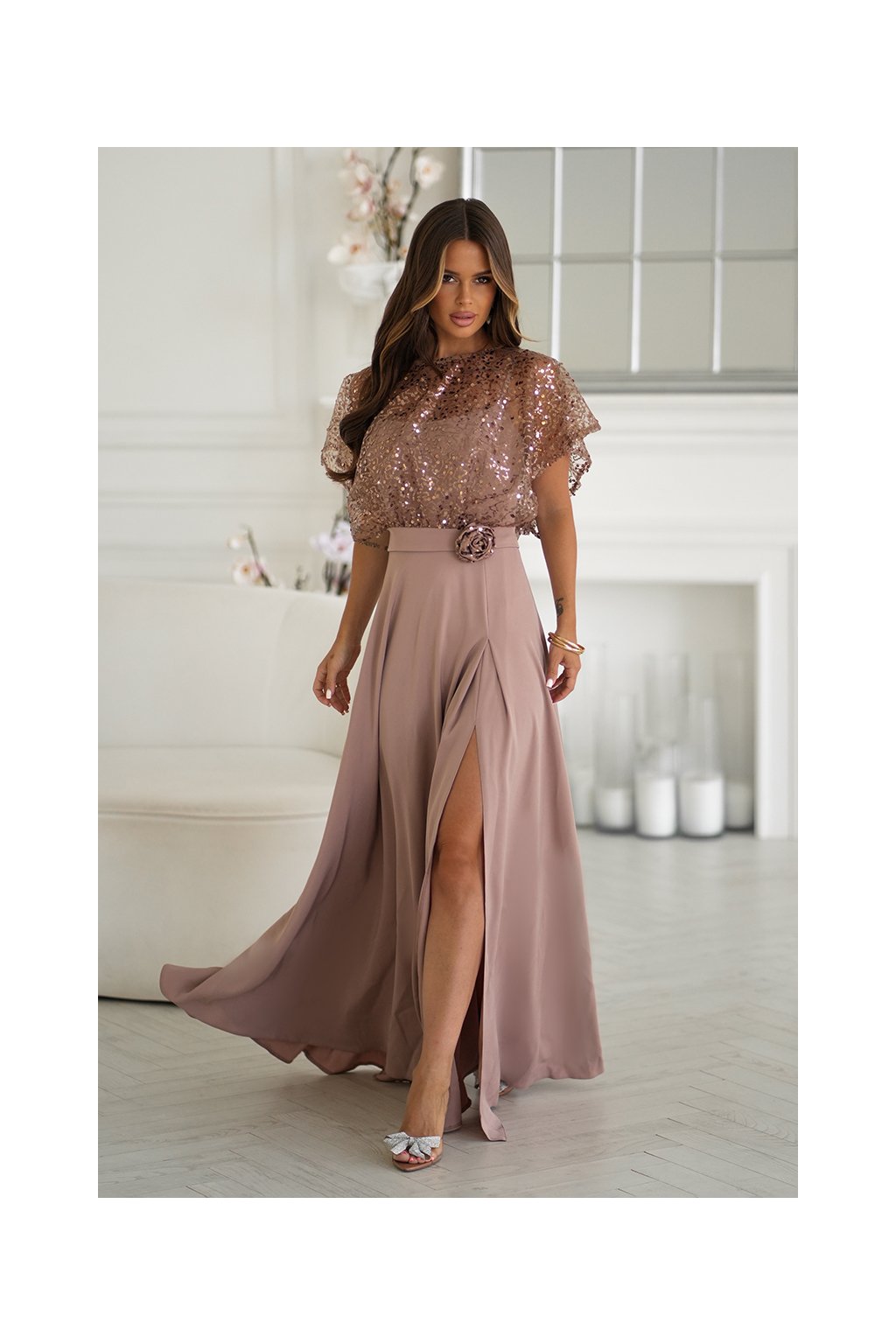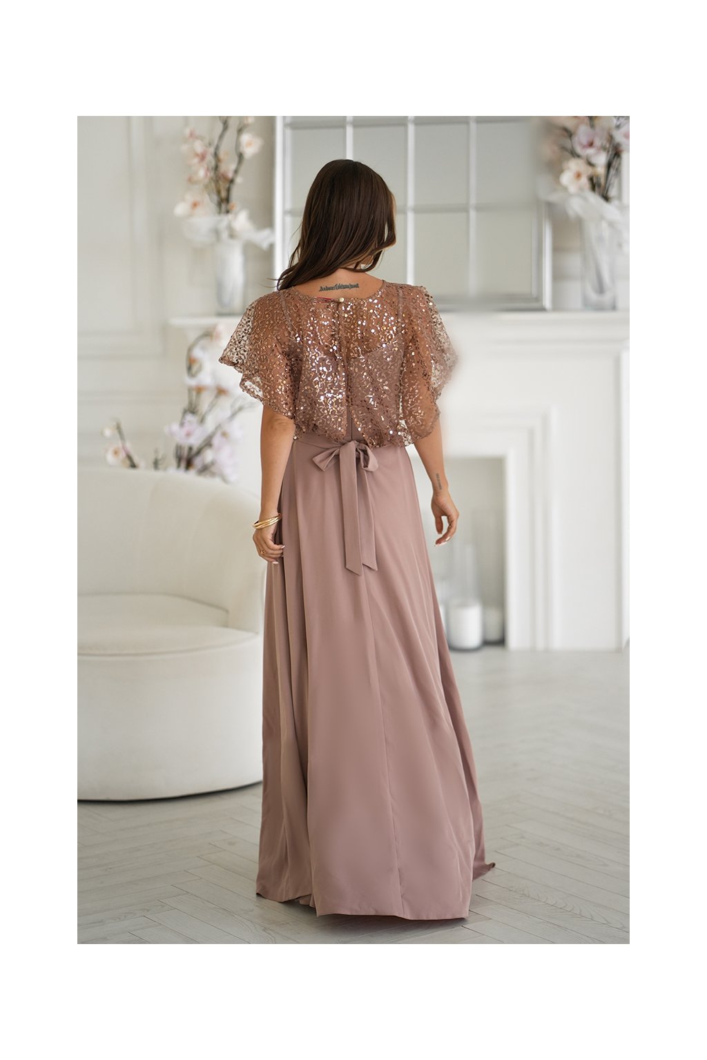 Jemné společenské šaty s lehkým, splývavým střihem působí velmi elegantně a slavnostně. Transparentní tylový top s flitry dodává modelu vzdušnost a jemný lesk, zatímco dlouhá sukně s rozparkem krásně prodlužuje siluetu. Ideální volba na svatby, plesy i jiné výjimečné příležitosti.