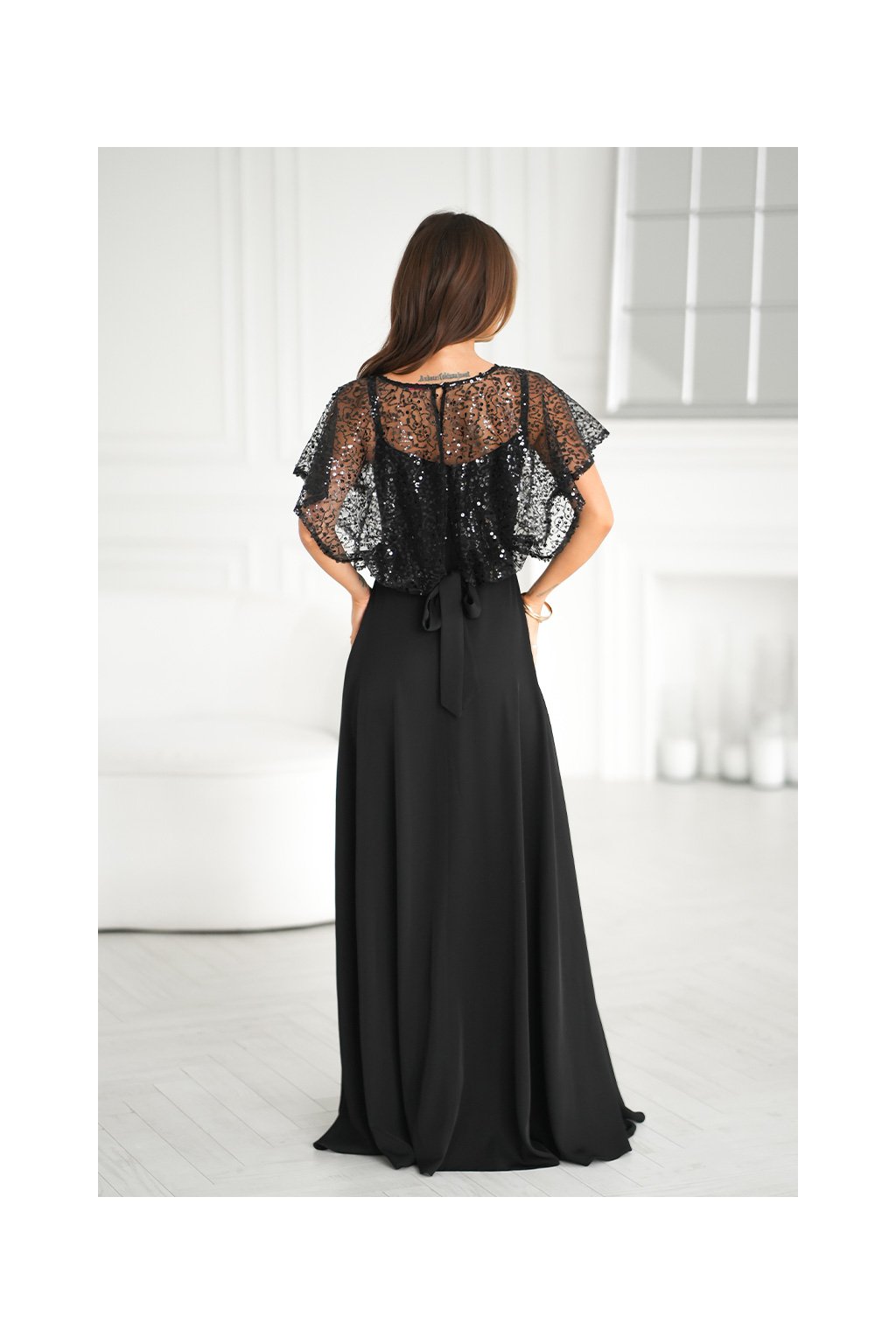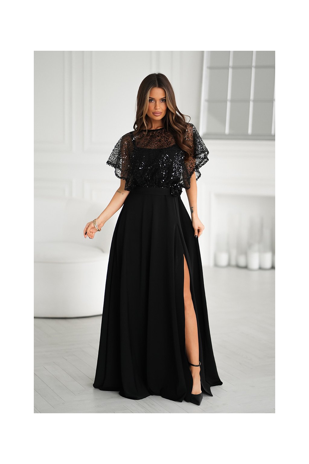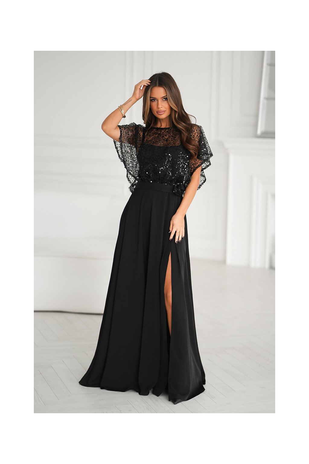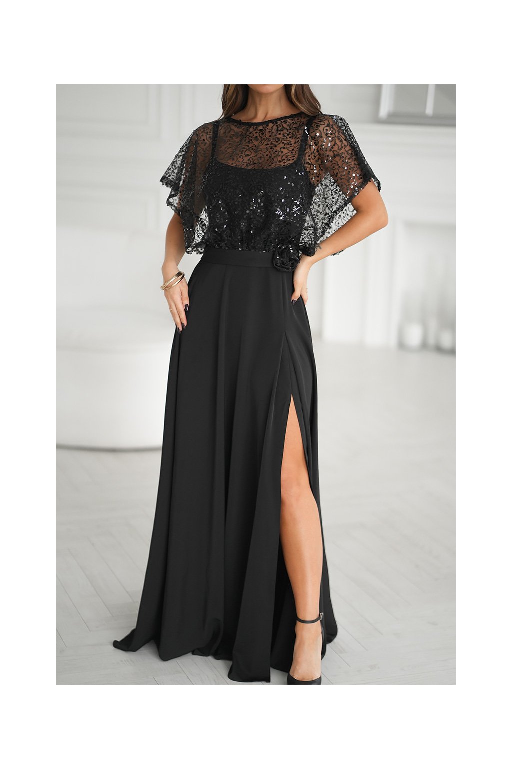 Jemné společenské šaty s lehkým, splývavým střihem působí velmi elegantně a slavnostně. Transparentní tylový top s flitry dodává modelu vzdušnost a jemný lesk, zatímco dlouhá sukně s rozparkem krásně prodlužuje siluetu. Ideální volba na svatby, plesy i jiné výjimečné příležitosti.