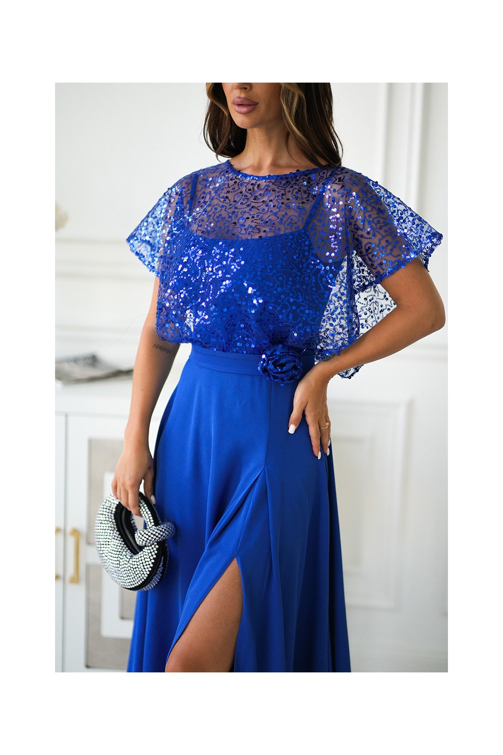 Jemné společenské šaty s lehkým, splývavým střihem působí velmi elegantně a slavnostně. Transparentní tylový top s flitry dodává modelu vzdušnost a jemný lesk, zatímco dlouhá sukně s rozparkem krásně prodlužuje siluetu. Ideální volba na svatby, plesy i jiné výjimečné příležitosti.