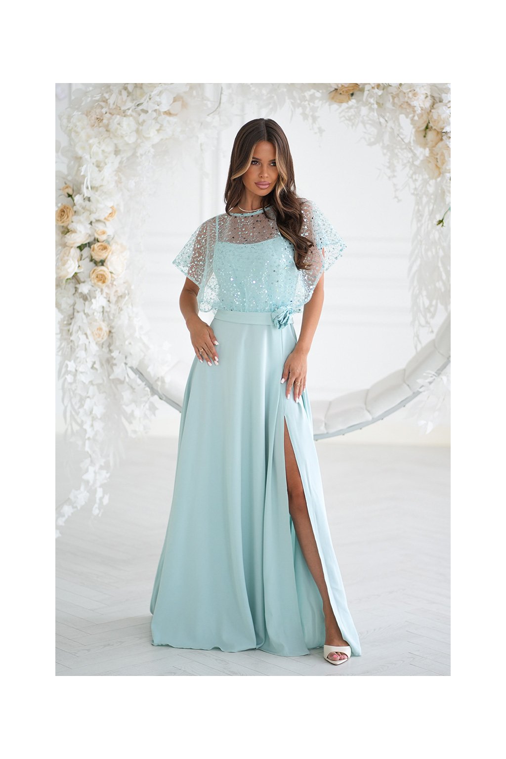 Jemné společenské šaty s lehkým, splývavým střihem působí velmi elegantně a slavnostně. Transparentní tylový top s flitry dodává modelu vzdušnost a jemný lesk, zatímco dlouhá sukně s rozparkem krásně prodlužuje siluetu. Ideální volba na svatby, plesy i jiné výjimečné příležitosti.