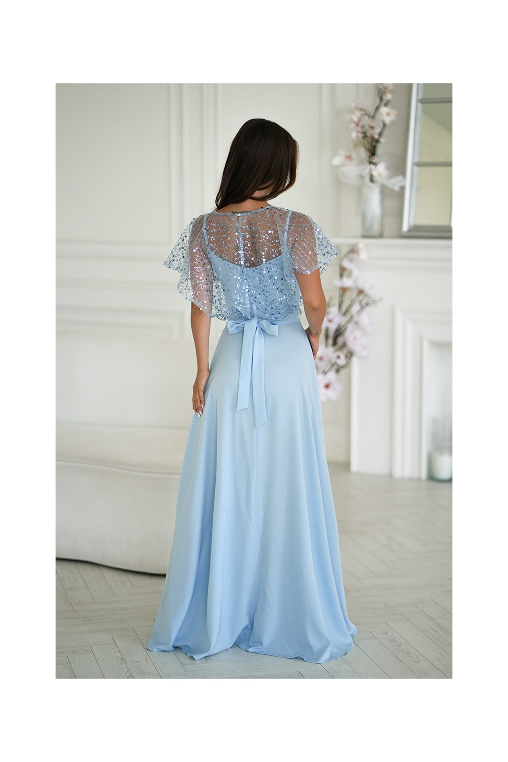Jemné společenské šaty s lehkým, splývavým střihem působí velmi elegantně a slavnostně. Transparentní tylový top s flitry dodává modelu vzdušnost a jemný lesk, zatímco dlouhá sukně s rozparkem krásně prodlužuje siluetu. Ideální volba na svatby, plesy i jiné výjimečné příležitosti.