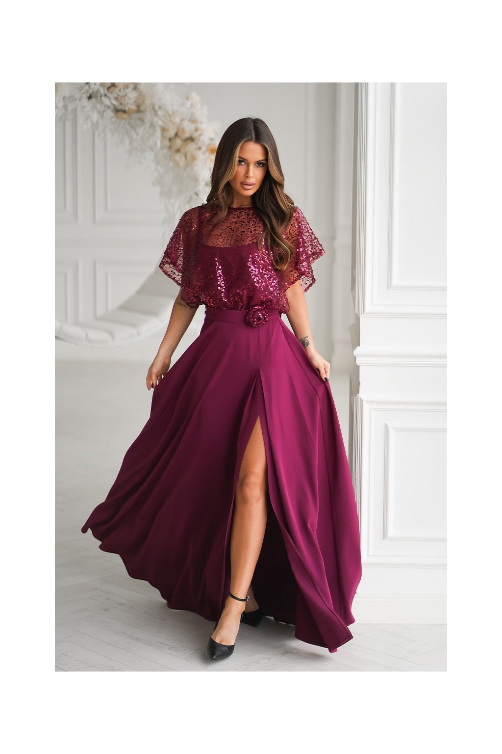 Jemné společenské šaty s lehkým, splývavým střihem působí velmi elegantně a slavnostně. Transparentní tylový top s flitry dodává modelu vzdušnost a jemný lesk, zatímco dlouhá sukně s rozparkem krásně prodlužuje siluetu. Ideální volba na svatby, plesy i jiné výjimečné příležitosti.