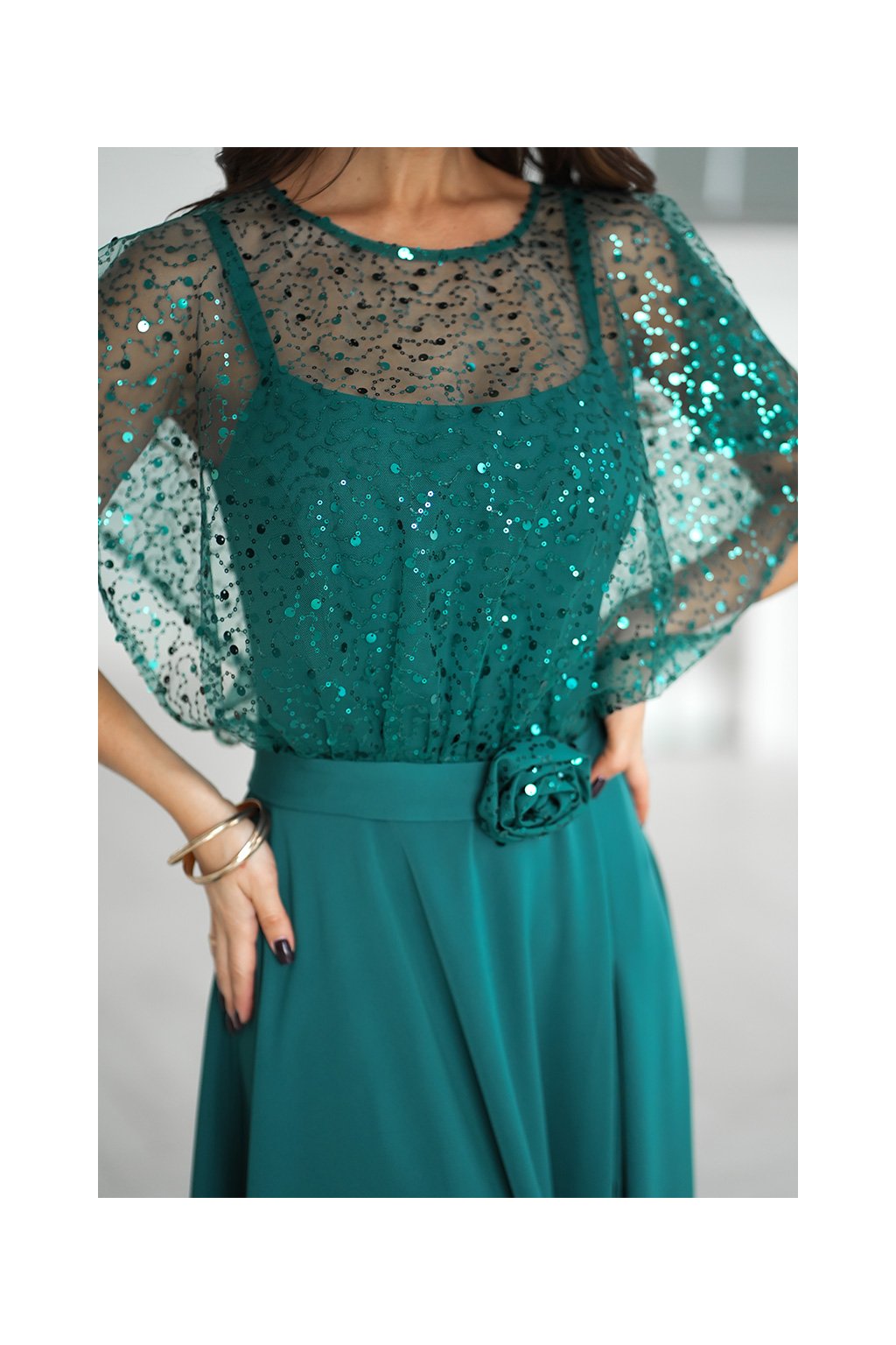 Detaily: flitrový tylový top, krátké rukávky, dekorativní květ v pase