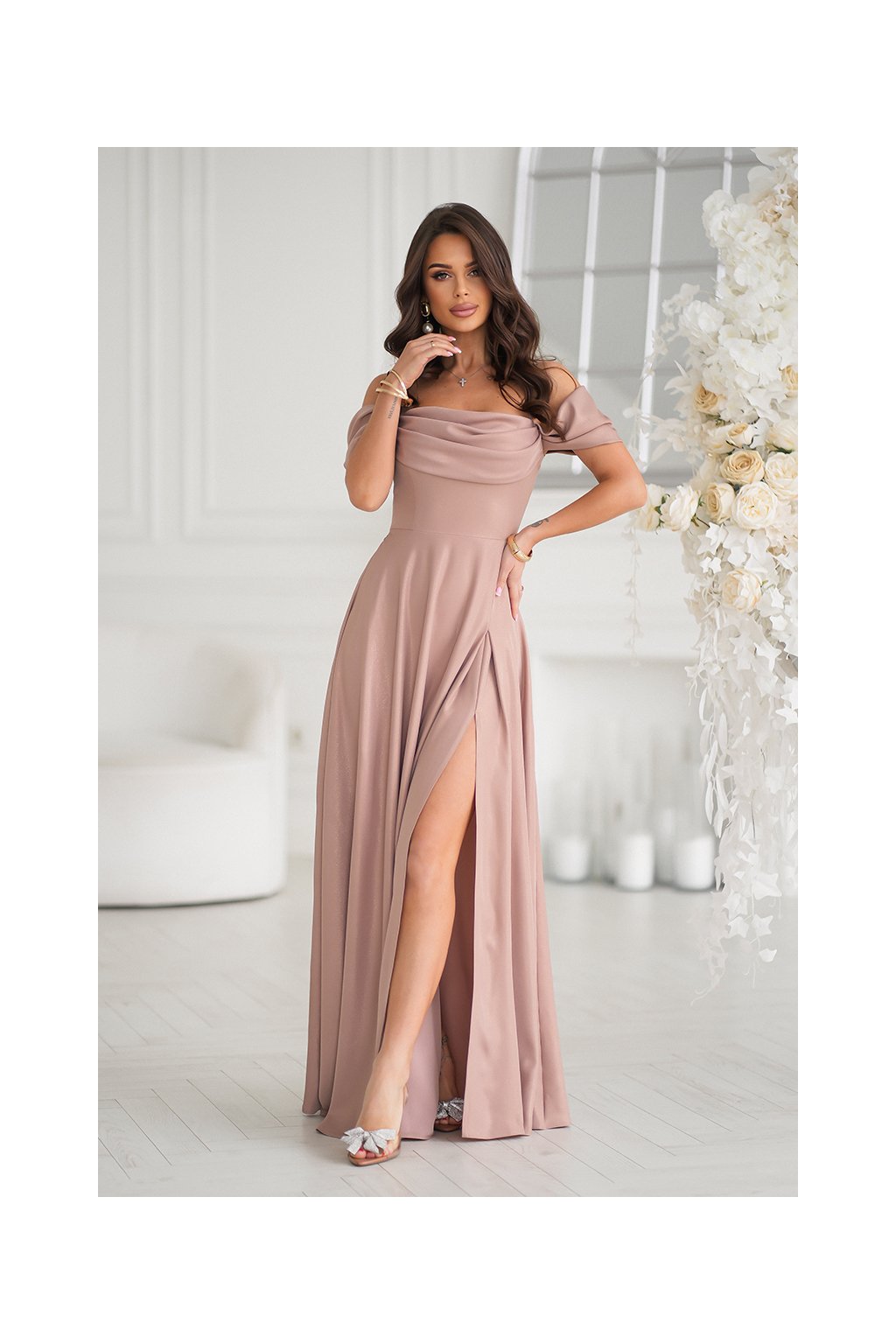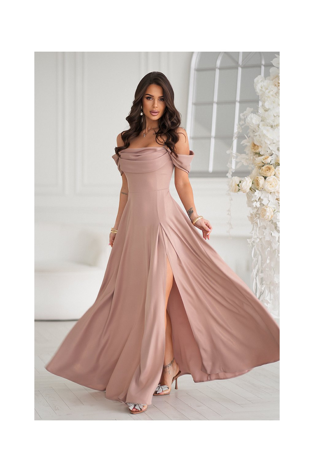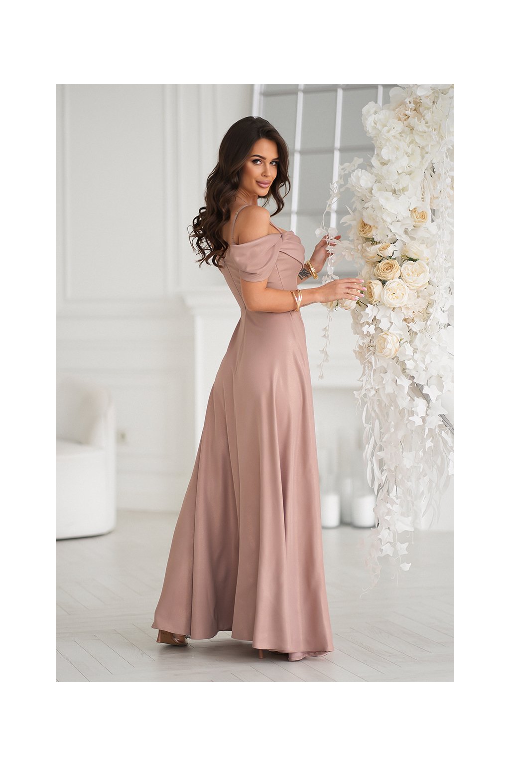 Elegantní dlouhé šaty s jemně splývavým střihem působí velmi žensky a sofistikovaně. Řasený živůtek s efektem vodopádu krásně zvýrazňuje dekolt, zatímco rozparek na sukni dodává modelu lehkost a smyslnost. Ideální volba pro plesy, svatby i slavnostní večerní události.