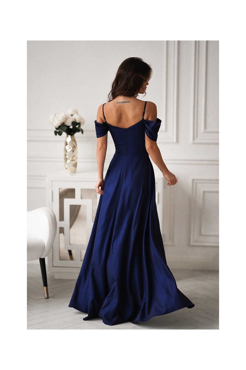 Detaily: řasený dekolt, odhalená ramena, vysoký rozparek