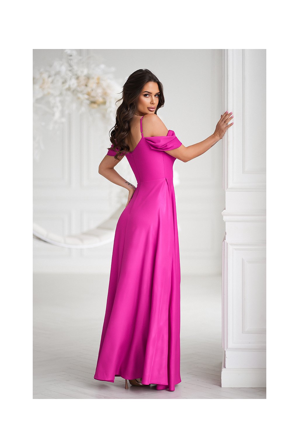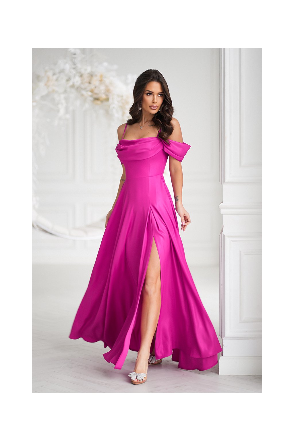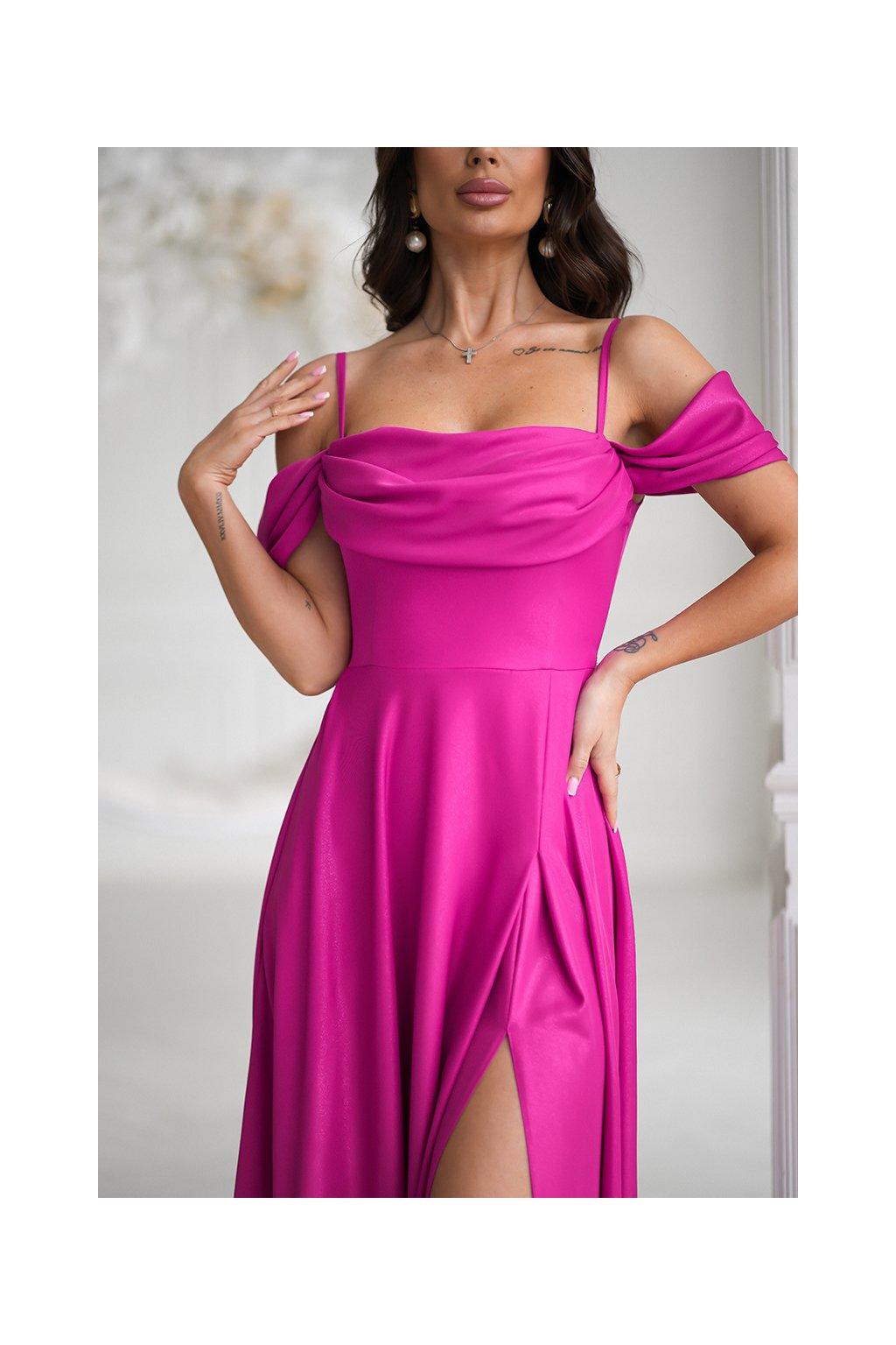 Detaily: řasený dekolt, odhalená ramena, vysoký rozparek