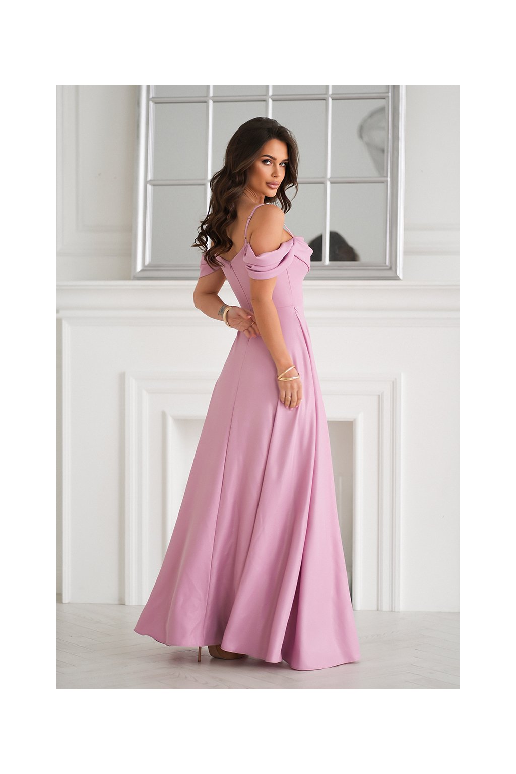 Detaily: řasený dekolt, odhalená ramena, vysoký rozparek