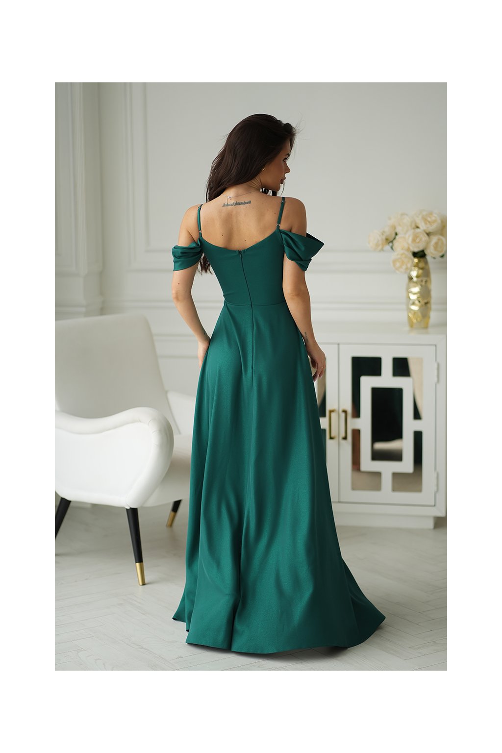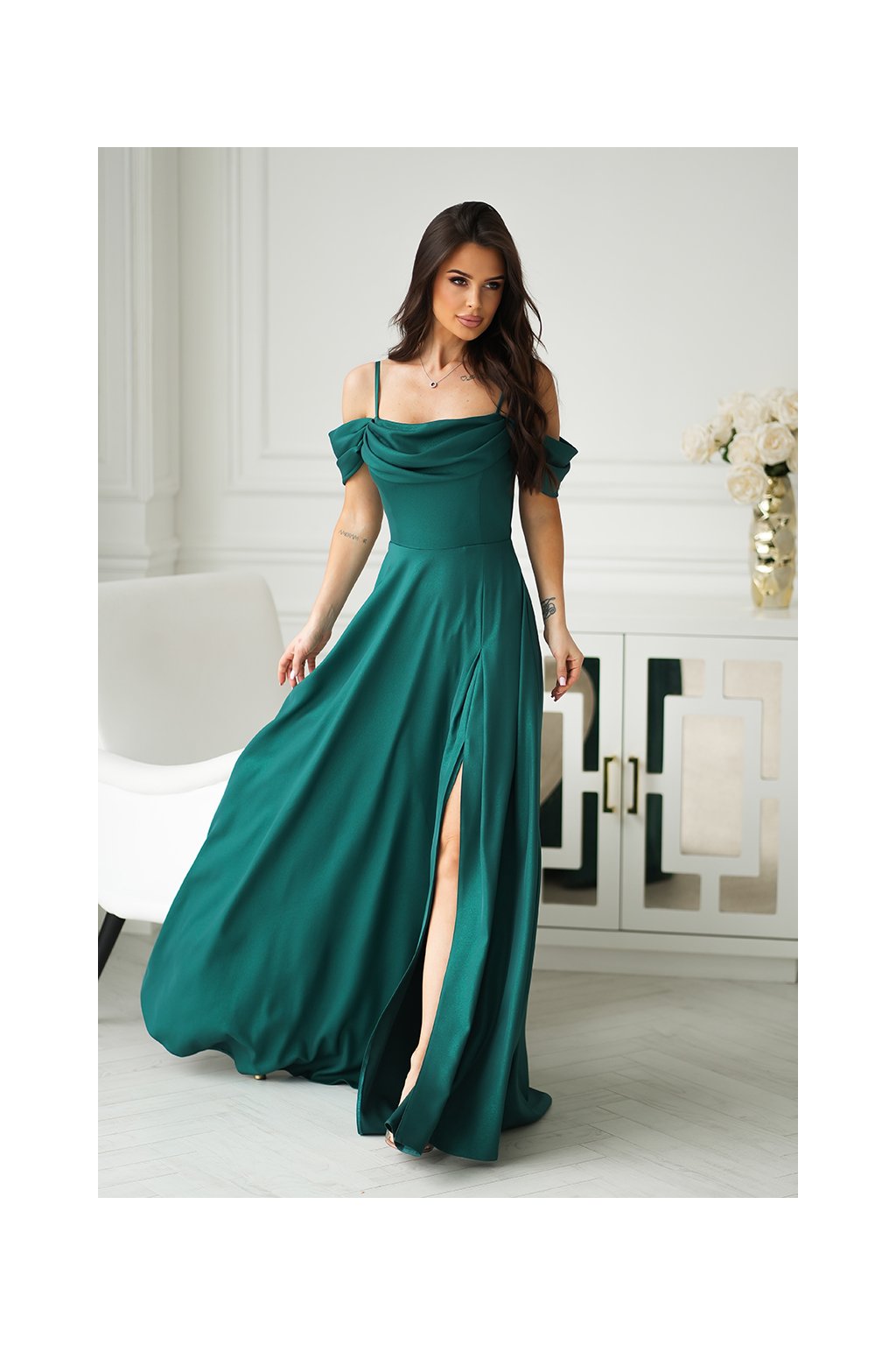 Detaily: řasený dekolt, odhalená ramena, vysoký rozparek