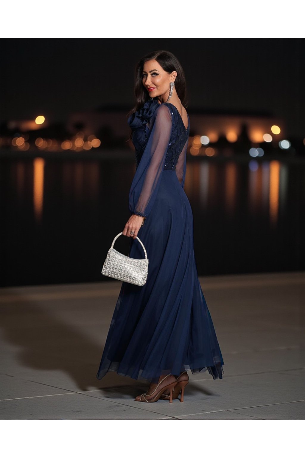 Elegantní šaty Stella v nádherné tmavě modré barvě jsou dokonalou volbou pro slavnostní příležitosti. Šaty mají rafinovaný střih s vysokým rozparkem, který přidává špetku odvážnosti, zatímco průhledné dlouhé rukávy dodávají šatům lehkost a romantický nádech. Výrazná aplikace ve tvaru květiny na rameni a třpytivý zdobený živůtek zvýrazňují jejich luxusní vzhled. Vyrobené z kvalitního materiálu, který se krásně přizpůsobí postavě a zaručí pohodlí po celý večer.