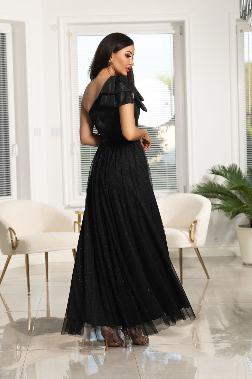 - Šaty mají asymetrický střih s jedním odhaleným ramenem, zdobeným volánem, a jemné třpytivé detaily, které jim dodávají luxusní vzhled.