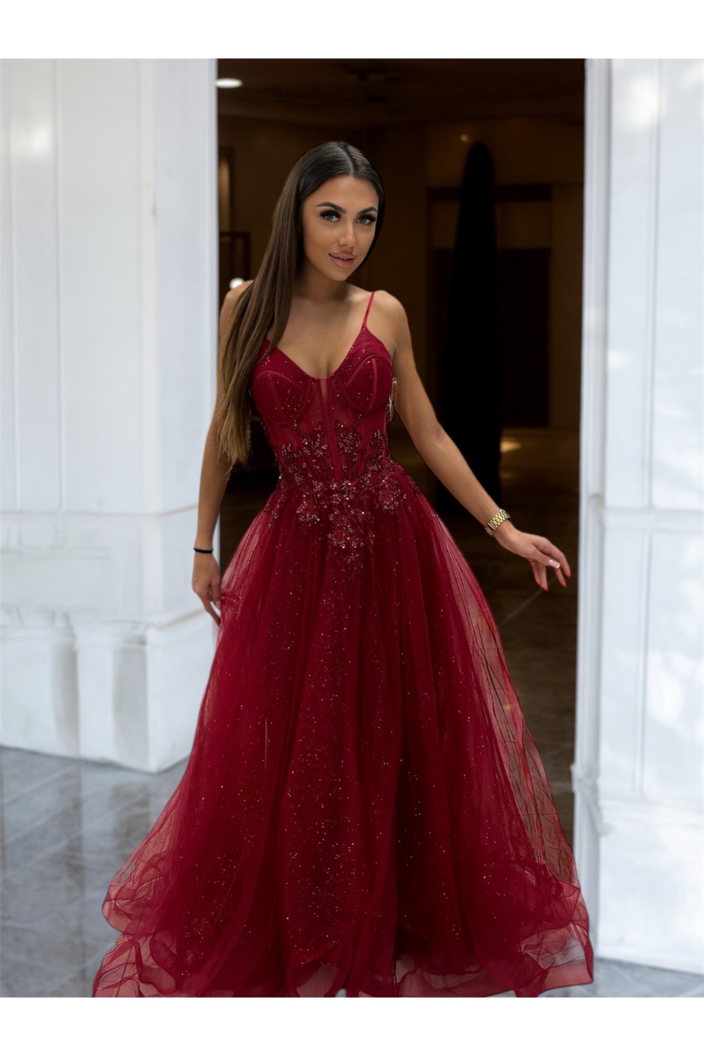 - Krásný odstín červené, který zvýrazní opálení, vypasovaný korzet, který zvýrazní postavu, nádherné křišťálové ozdoby, které ji rozzáří.