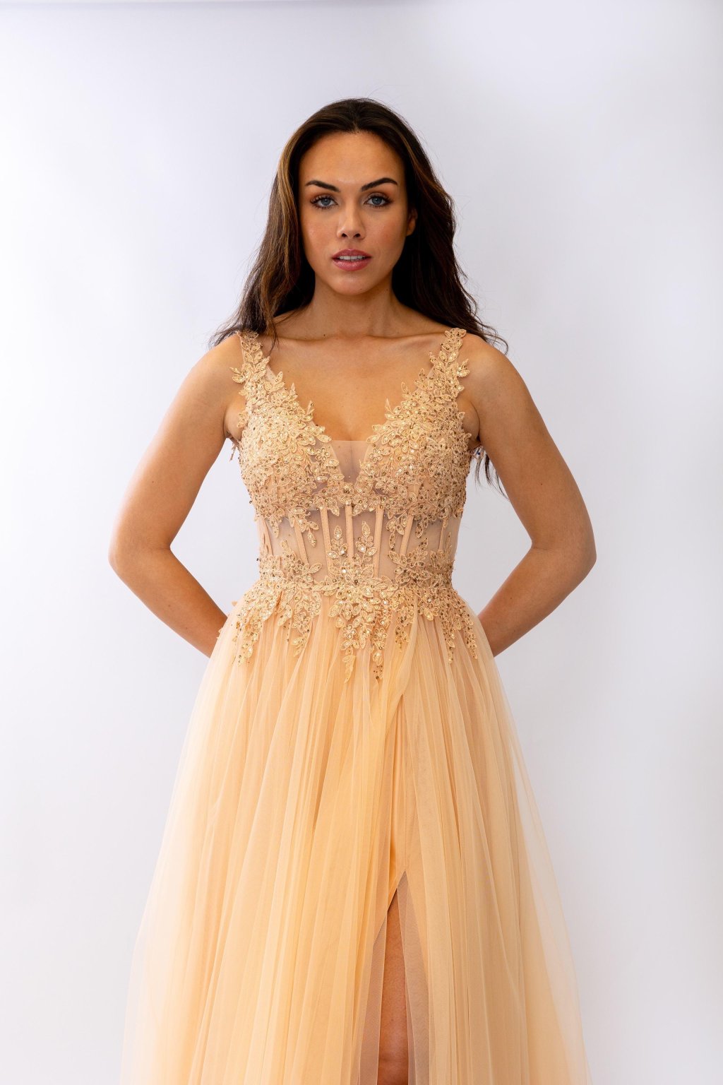 Korzetový živůtek zdobený krajkou a jemnými flitry krásně zvýrazní postavu, zatímco lehká tylová sukně s rozparkem působí vzdušně a romanticky. Šněrování na zádech zajistí dokonalé přizpůsobení. Tyto šaty jsou skvělou volbou na ples, svatbu či jinou slavnostní událost. Dostupné v mnoha barvách.