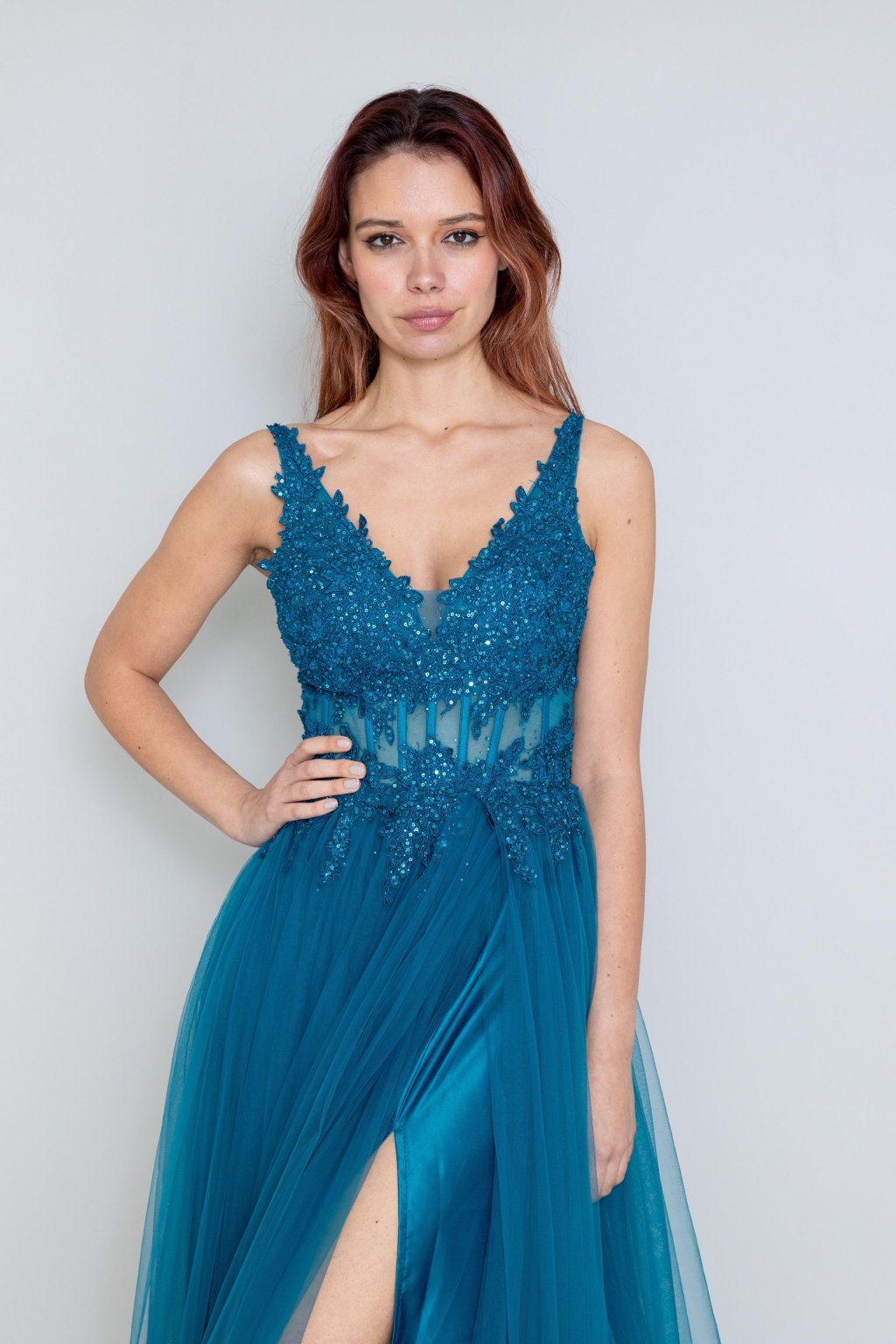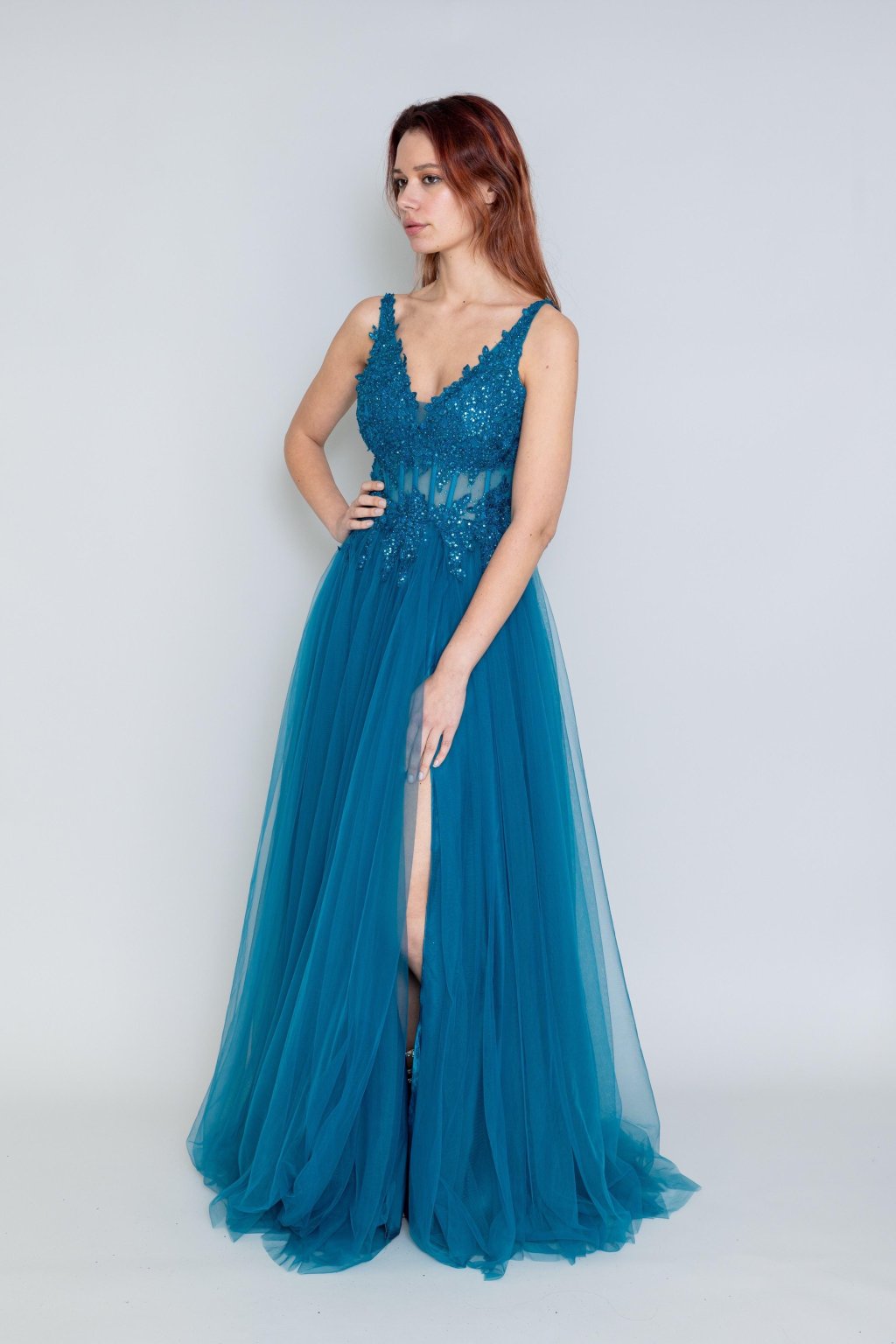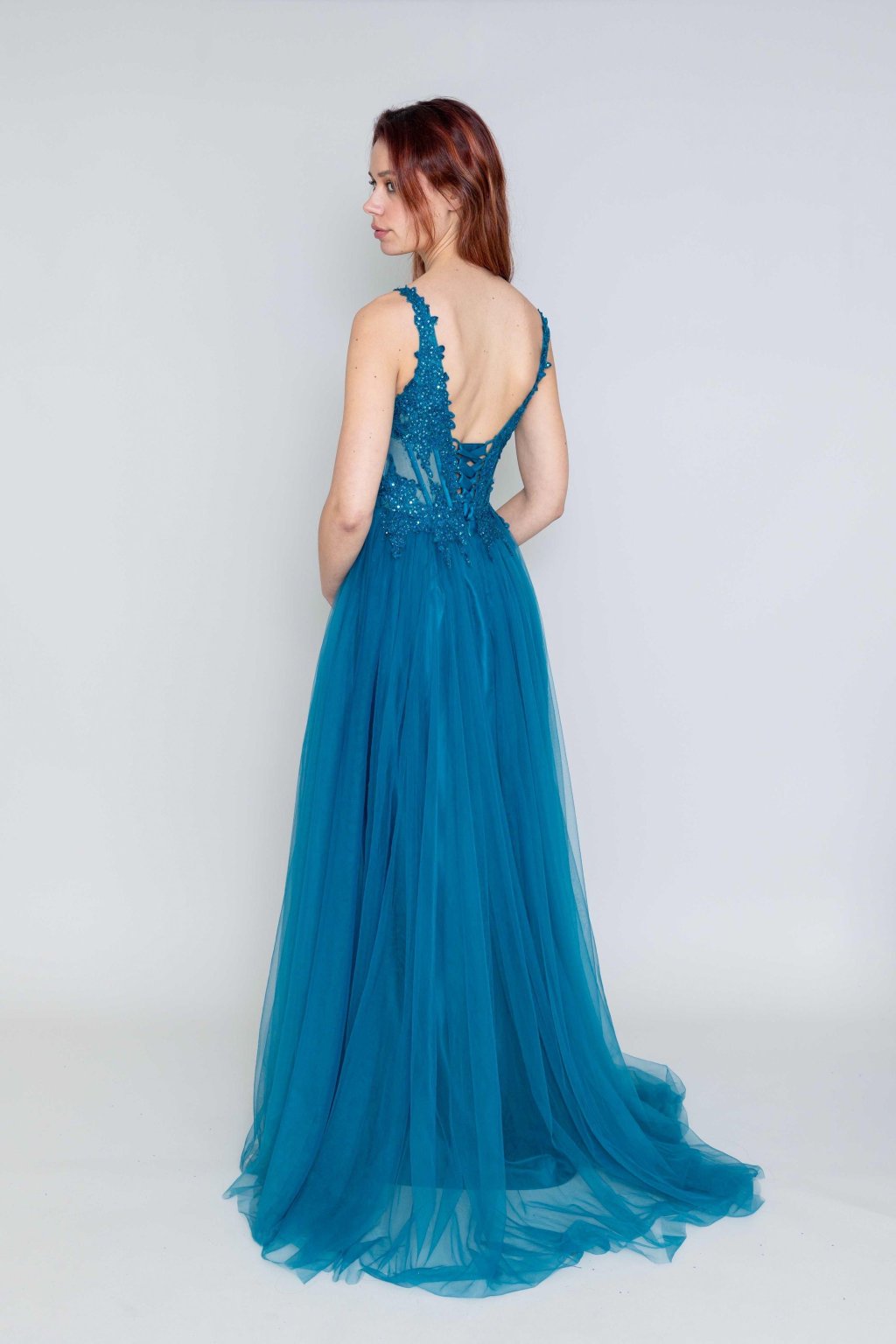 Korzetový živůtek zdobený krajkou a jemnými flitry krásně zvýrazní postavu, zatímco lehká tylová sukně s rozparkem působí vzdušně a romanticky. Šněrování na zádech zajistí dokonalé přizpůsobení. Tyto šaty jsou skvělou volbou na ples, svatbu či jinou slavnostní událost. Dostupné v mnoha barvách.