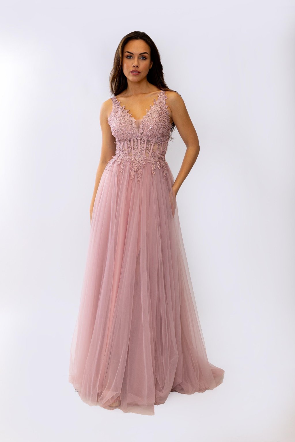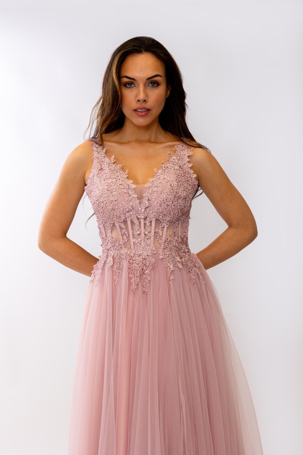 Korzetový živůtek zdobený krajkou a jemnými flitry krásně zvýrazní postavu, zatímco lehká tylová sukně s rozparkem působí vzdušně a romanticky. Šněrování na zádech zajistí dokonalé přizpůsobení. Tyto šaty jsou skvělou volbou na ples, svatbu či jinou slavnostní událost. Dostupné v mnoha barvách.