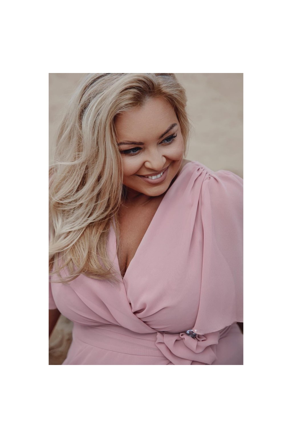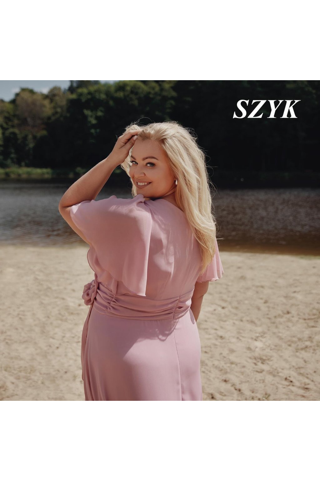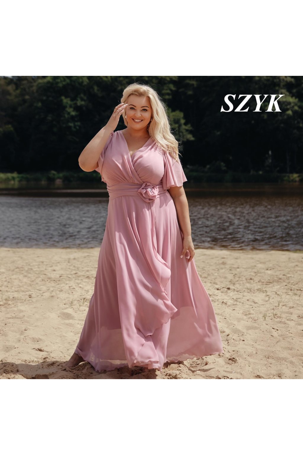 Okouzlující společenské šaty značky SZYK v pudrově růžové barvě. Tento elegantní model se vyznačuje překrásným překládaným výstřihem do V, který lichotivě rámuje dekolt a vytváří romantickou siluetu.