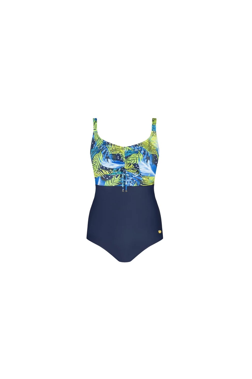 Nadčasový střih zvýrazňuje ženské křivky a horní část zdobí jemný květinový vzor v modrých tónech, který dodává celému modelu svěží letní vzhled.