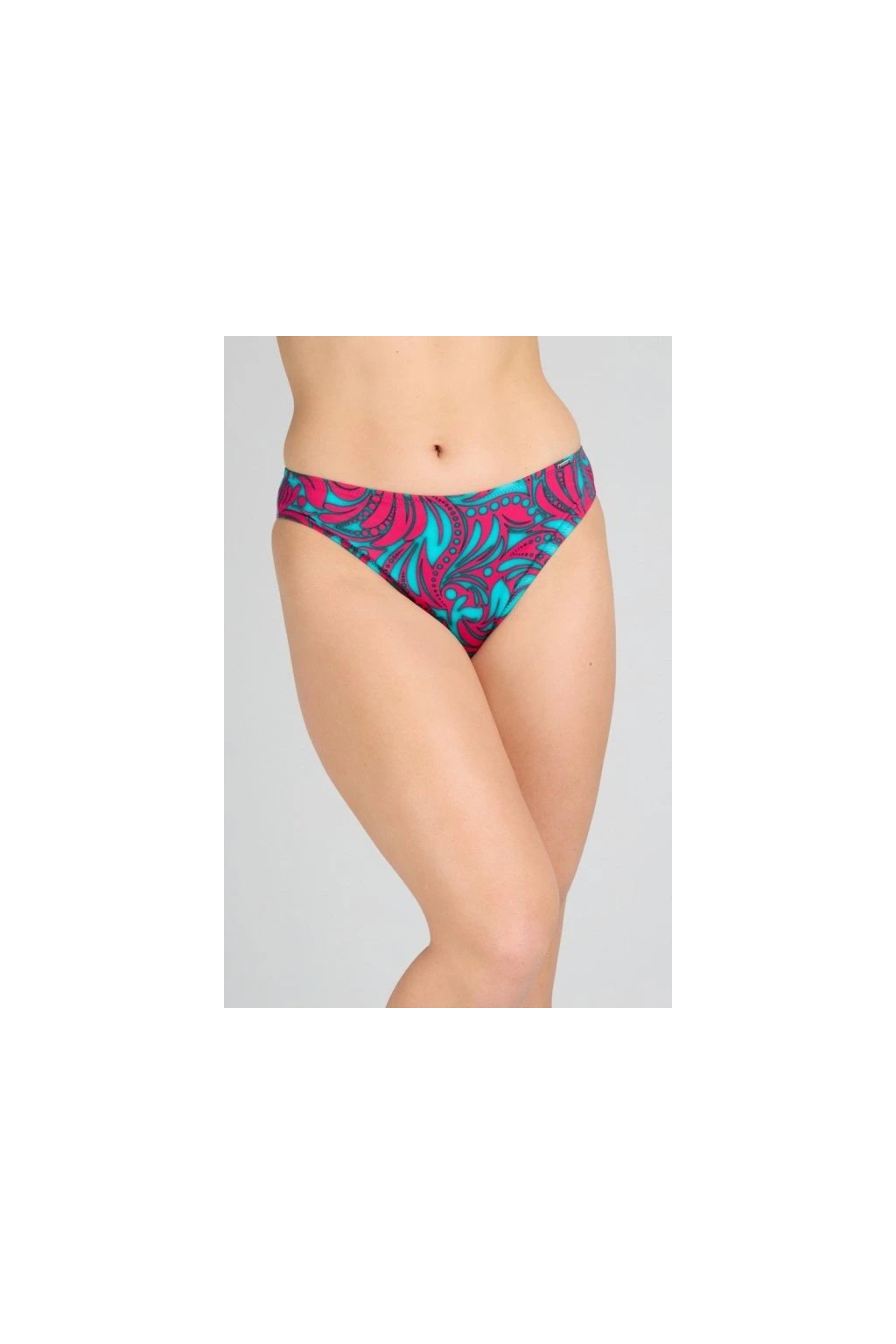 Klasické plavkové kalhotky ve fuchsiové a tyrkysové barvě s letním vzorem. Klasické plavkové kalhotky perfektně sedí každé postavě a zajišťují pohodlí při celodenním nošení. Kombinace zářivé fuchsiové a tyrkysové barvy dodává plavkám hravý vzhled, který okamžitě upoutá pozornost. Pořiďte si k plavkovým kalhotkám také podprsenku ze stejné kolekce a získejte atraktivní set dvoudílných plavek.