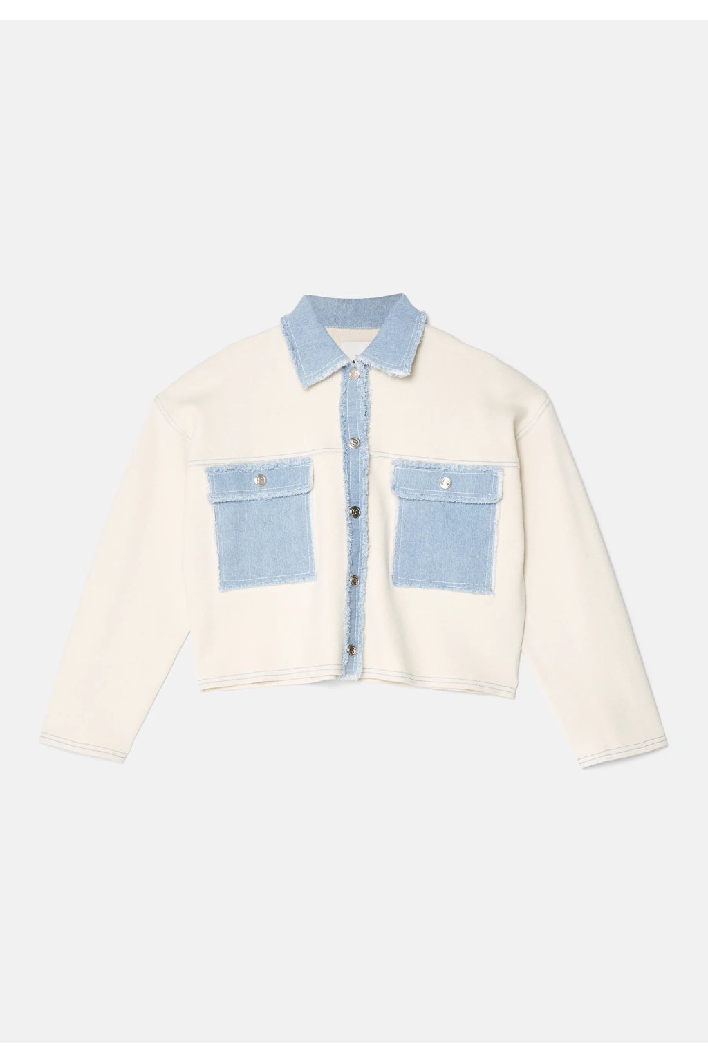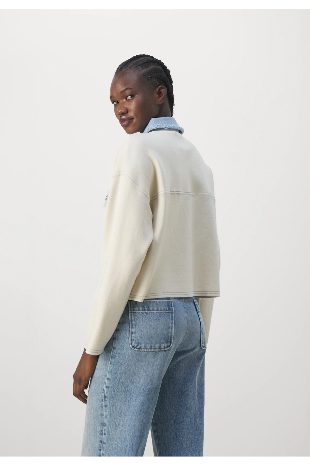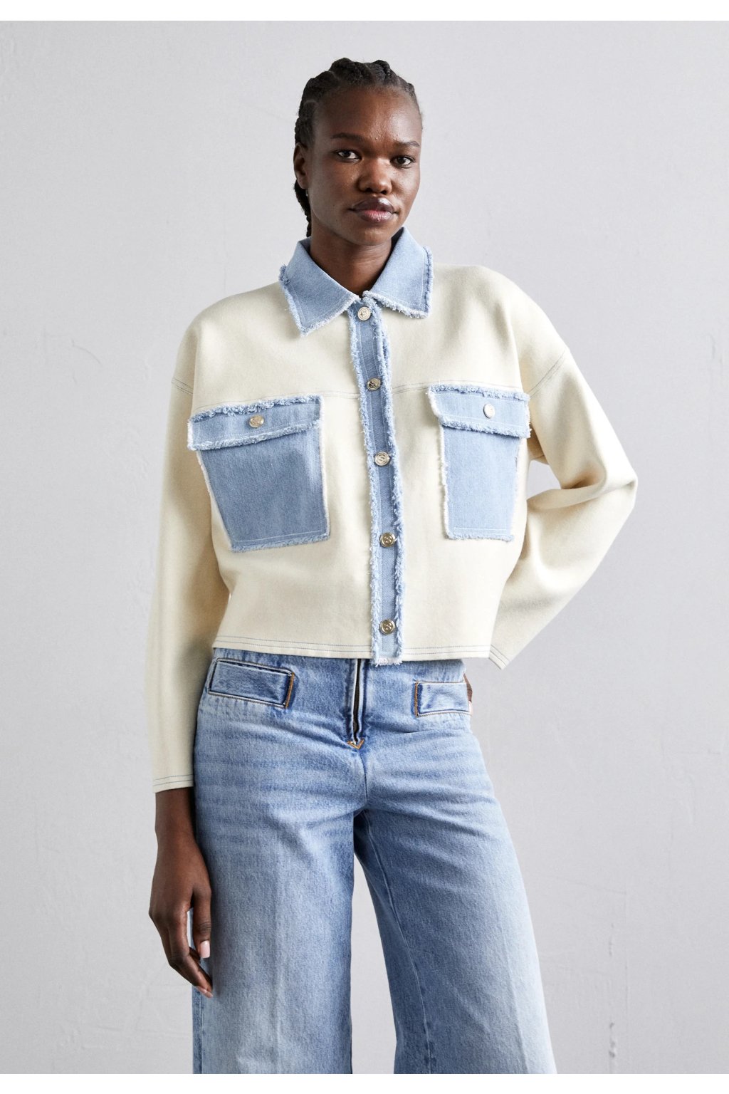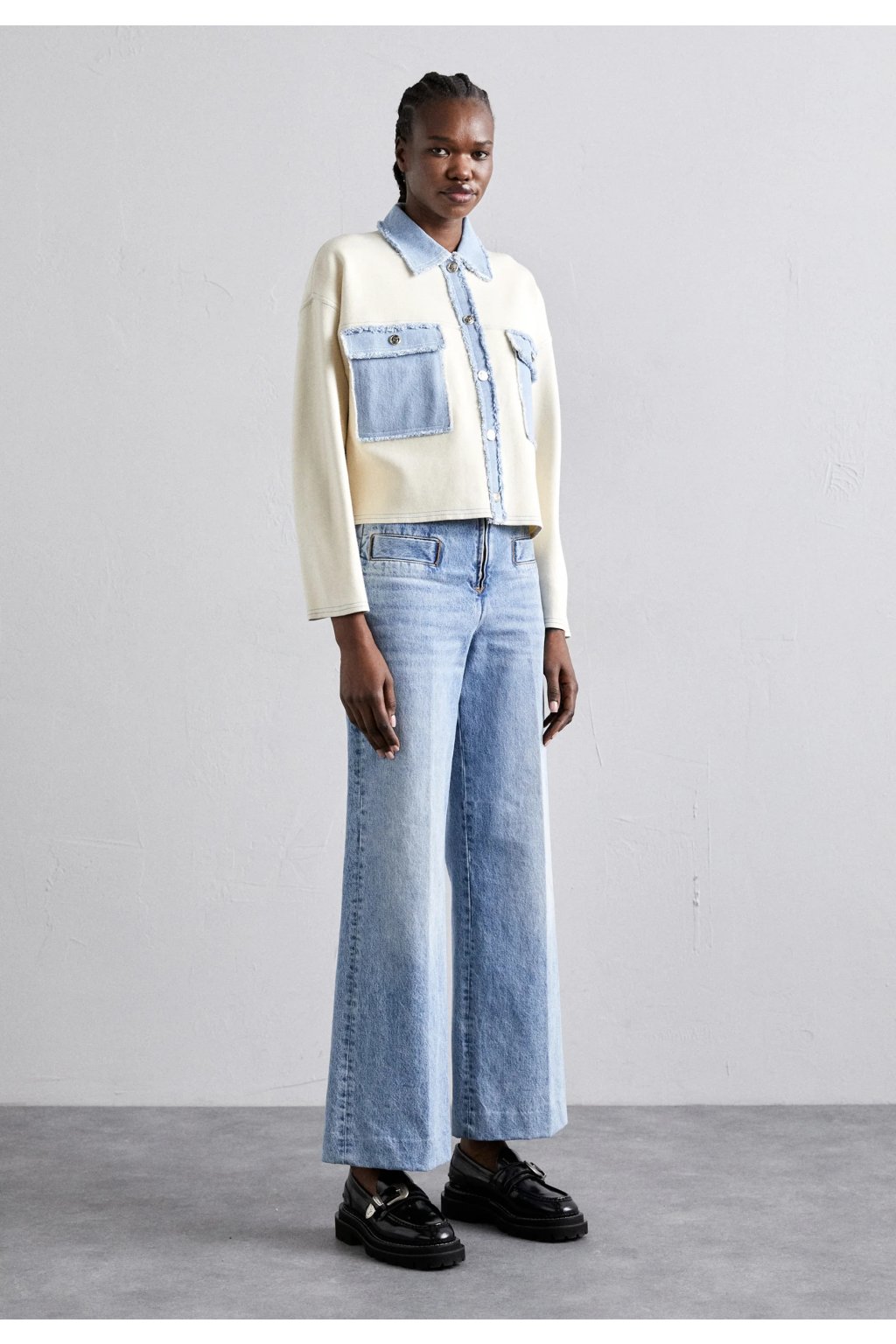Stylový a výrazný kousek od značky Sandro Paris, který spojuje pohodlí s jedinečným designem. Tento krátký kardigan v barvě ecru je vyroben z příjemného úpletu a ozdoben kontrastními džínovými detaily – límečkem, légou a dvěma předními kapsami s knoflíkem. Ležérní střih s rovnými rukávy a jemně zkrácenou délkou skvěle doplní džíny, sukně i šaty.