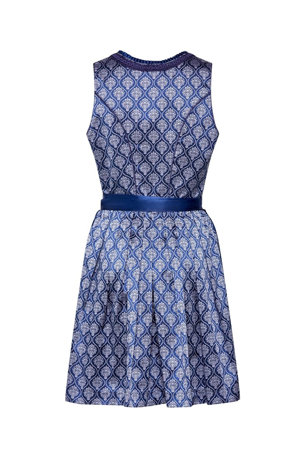Dirndl je bez rukávů, s decentním výstřihem lemovaným jemnou plisovanou stuhou, což podtrhuje jeho tradiční, ale přitom moderní design. Díky střihu a použitému materiálu je dirndl pohodlný na nošení a vhodný jak pro slavnostní příležitosti, tak tradiční festivaly.