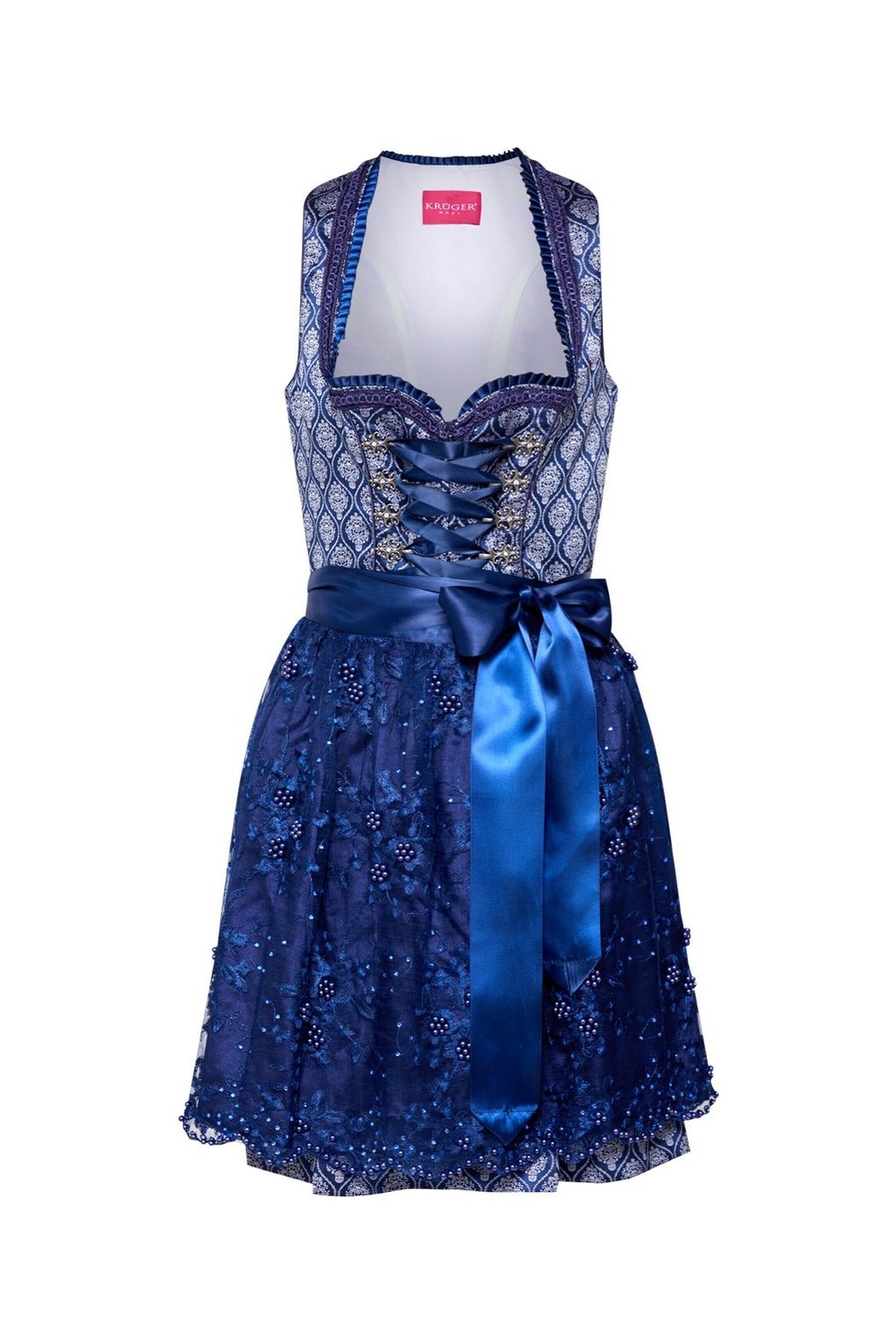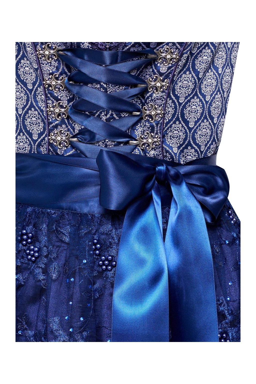 Vrchní část dirndlu je zdobena dekorativním šněrováním s originálními kovovými háčky a modrou stuhou, která zároveň slouží jako pásek a můžete ji uvázat do půvabné mašle. Sukně je vyrobena z luxusní krajky zdobené modrými perličkami a drobnými třpytivými kamínky, což přidává celému modelu nádech ženskosti a elegance.