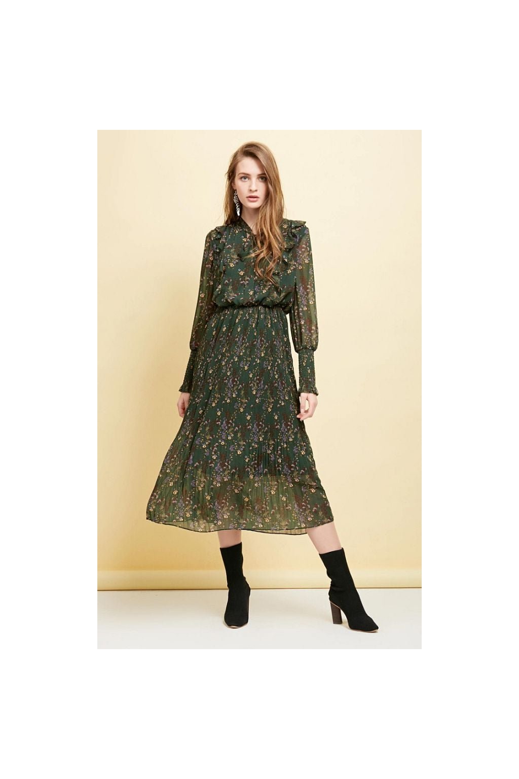 Romantika v moderním provedení – tyto elegantní dlouhé šaty od Vero Moda jsou ideální volbou pro všechny, kdo milují ženskost, pohodlí a nadčasový styl. Jemný květinový vzor na sytě zeleném podkladu dodává šatům jemný vintage nádech, zatímco moderní střih s lehce nařaseným pasem a plisovanou sukní lichotí každé postavě.
