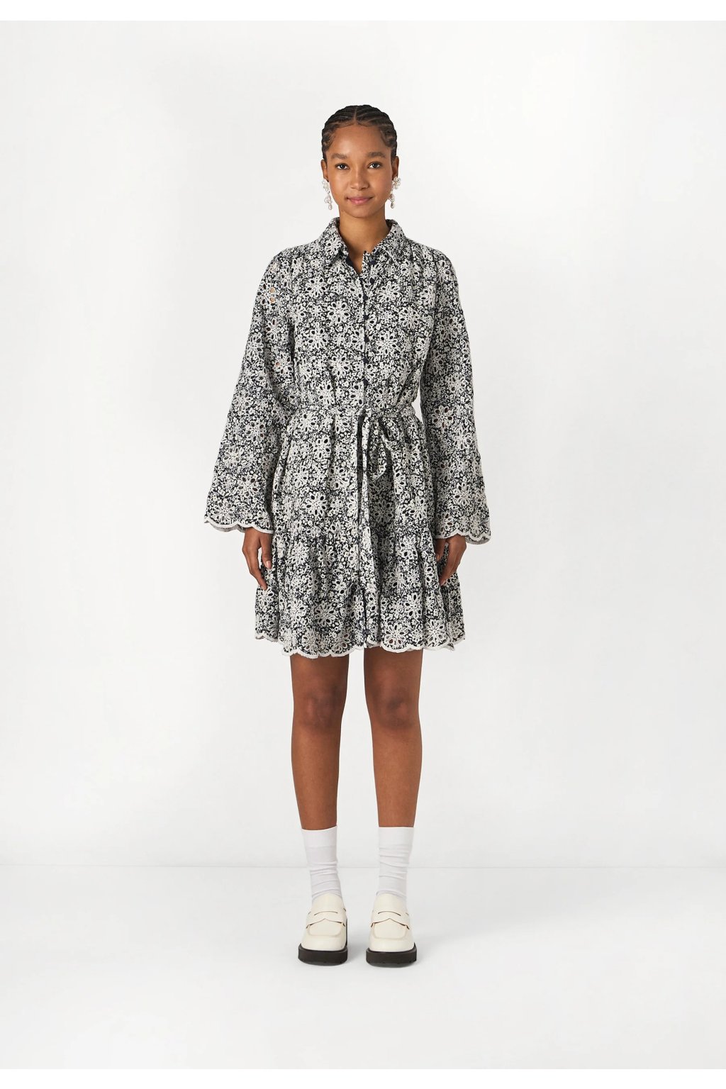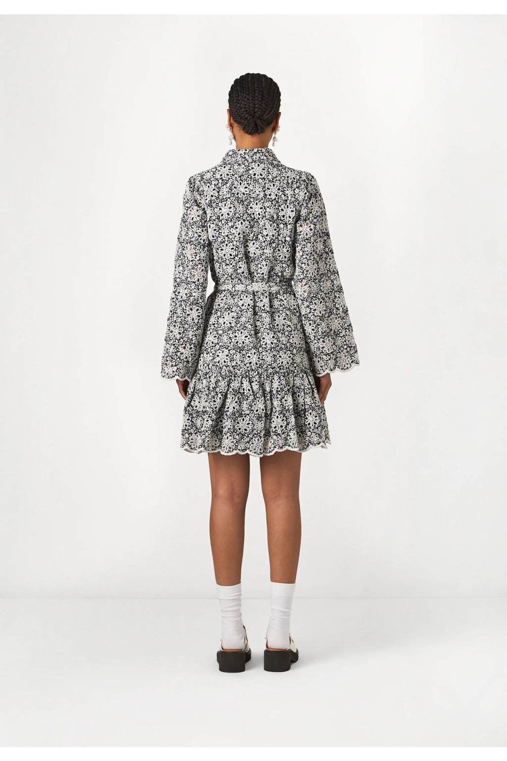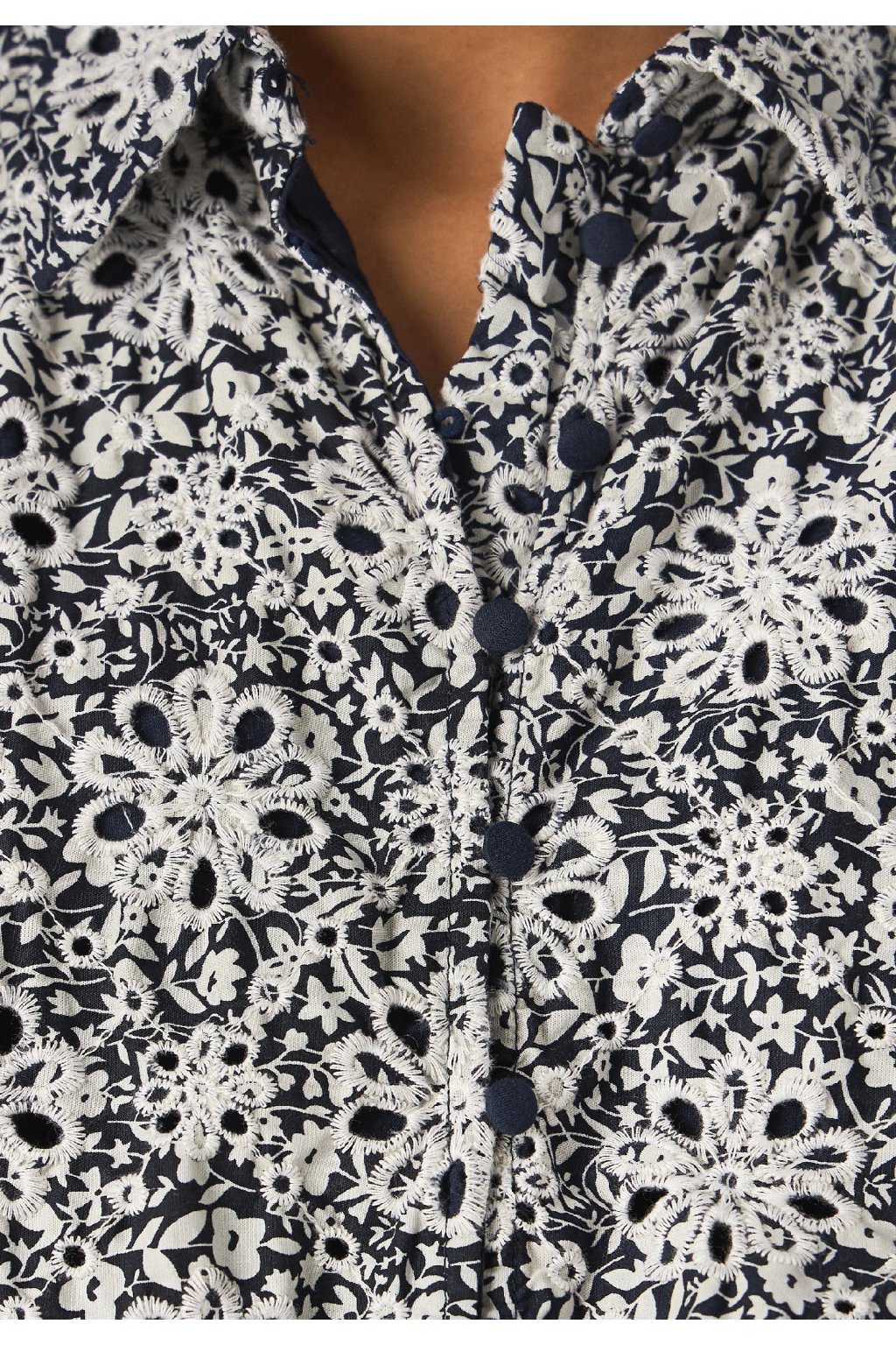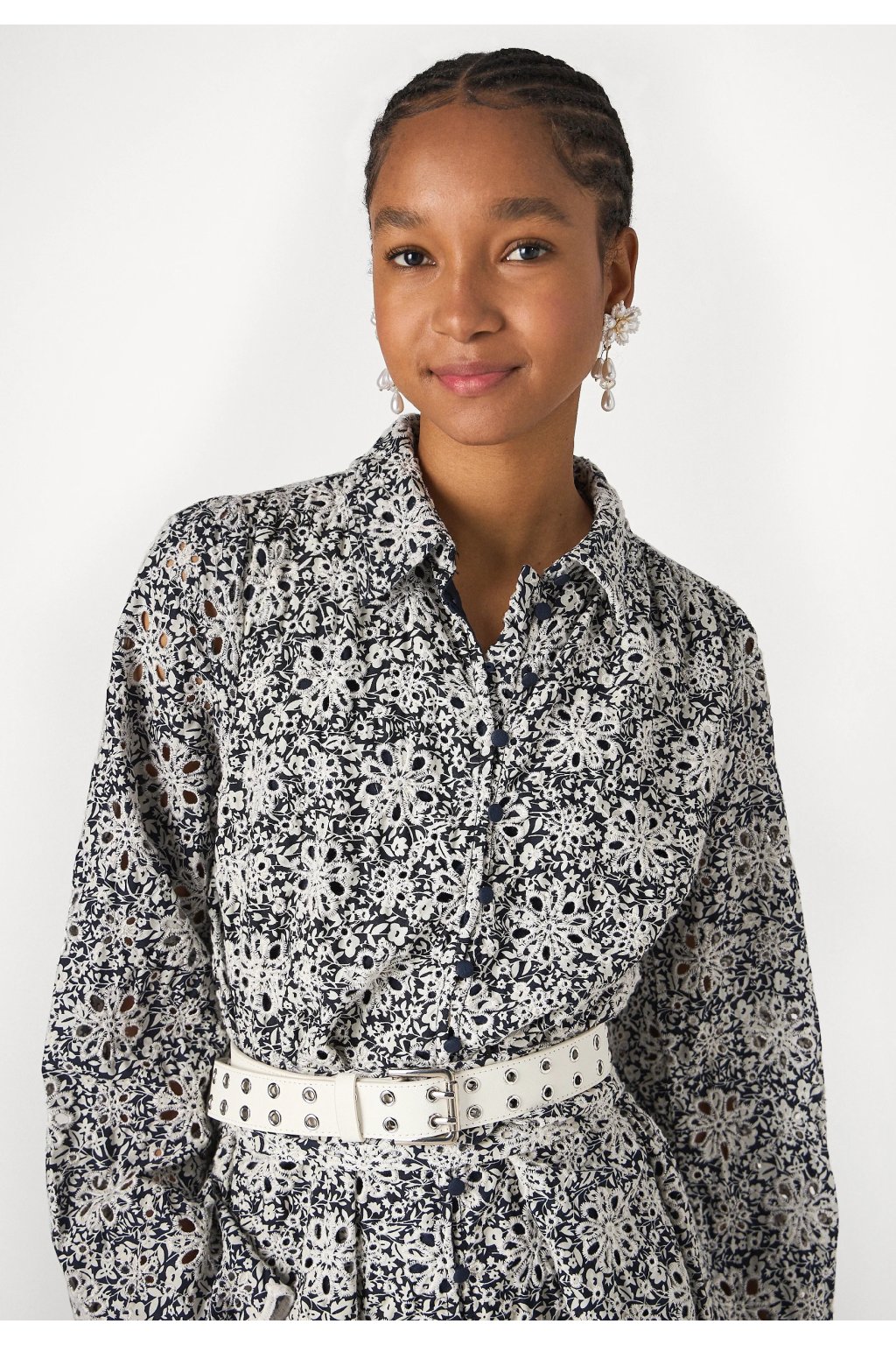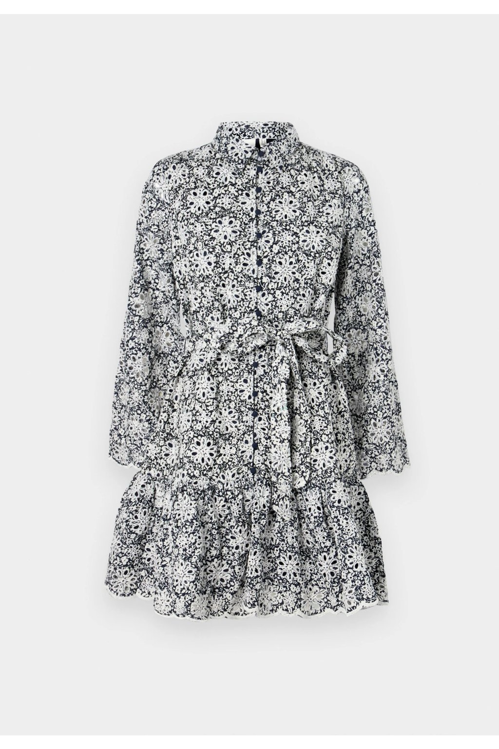 Krásné šaty z tkaného materiálu. Šaty mají límeček, dlouhé rukávy a odnímatelný pásek v pase. Tmavě modrá barva jako základ, doplněná vyšívanými květinami a bílými detaily. Tak nádherné!
