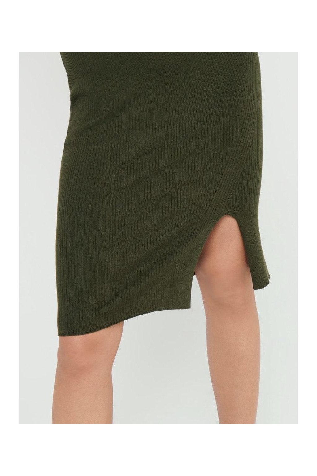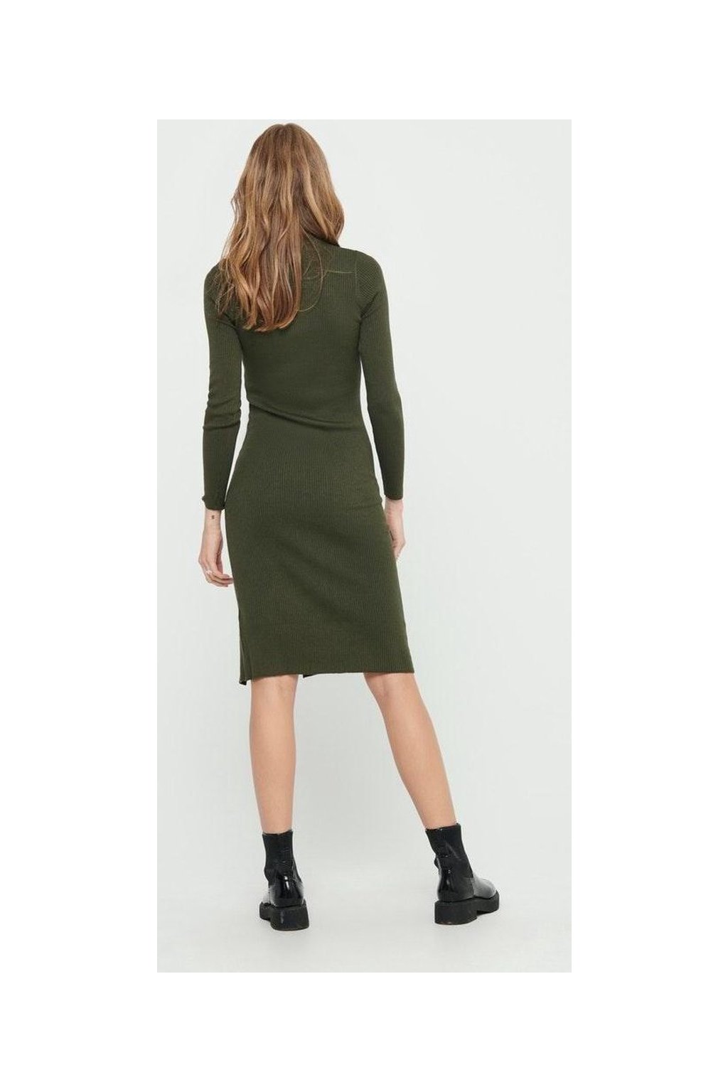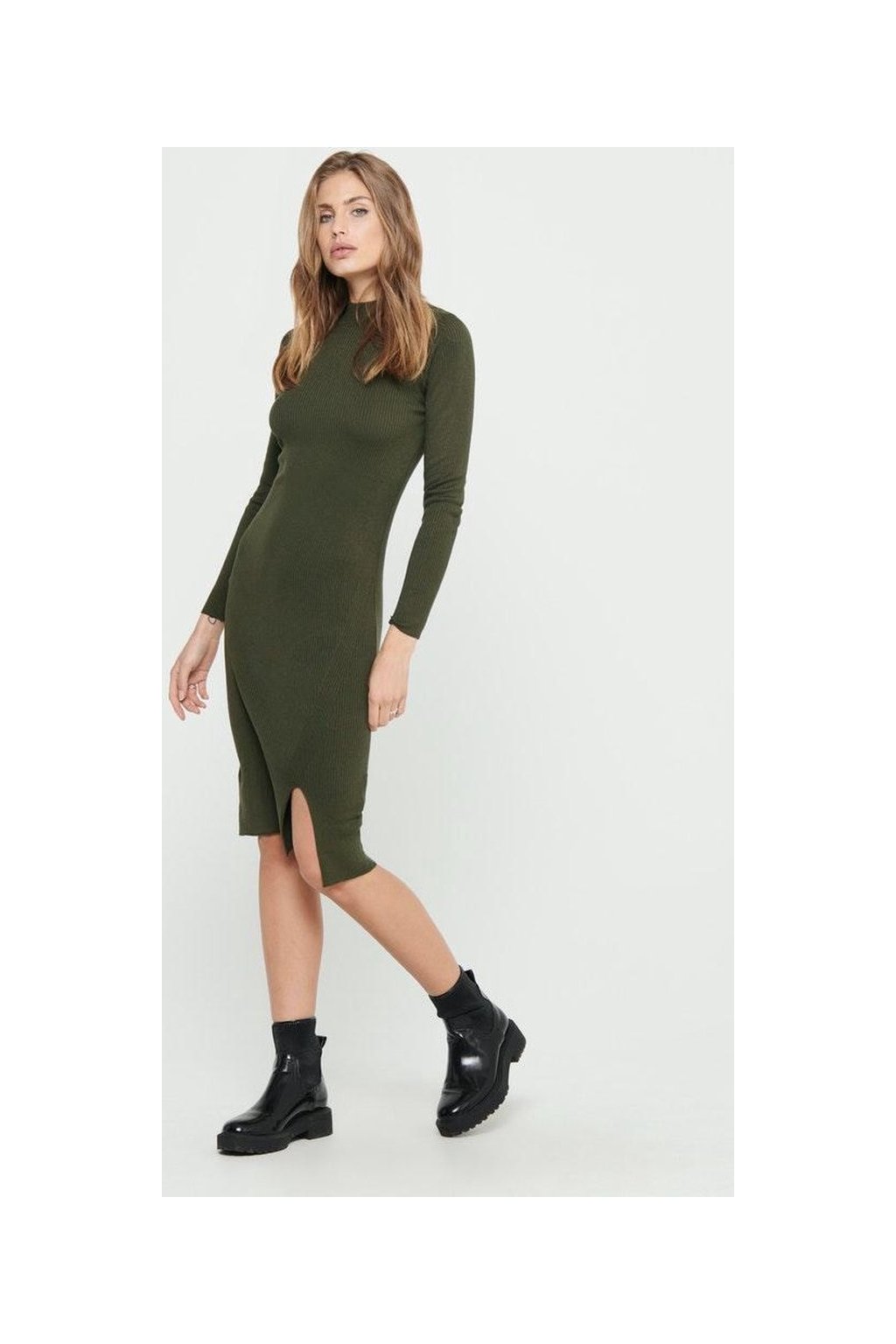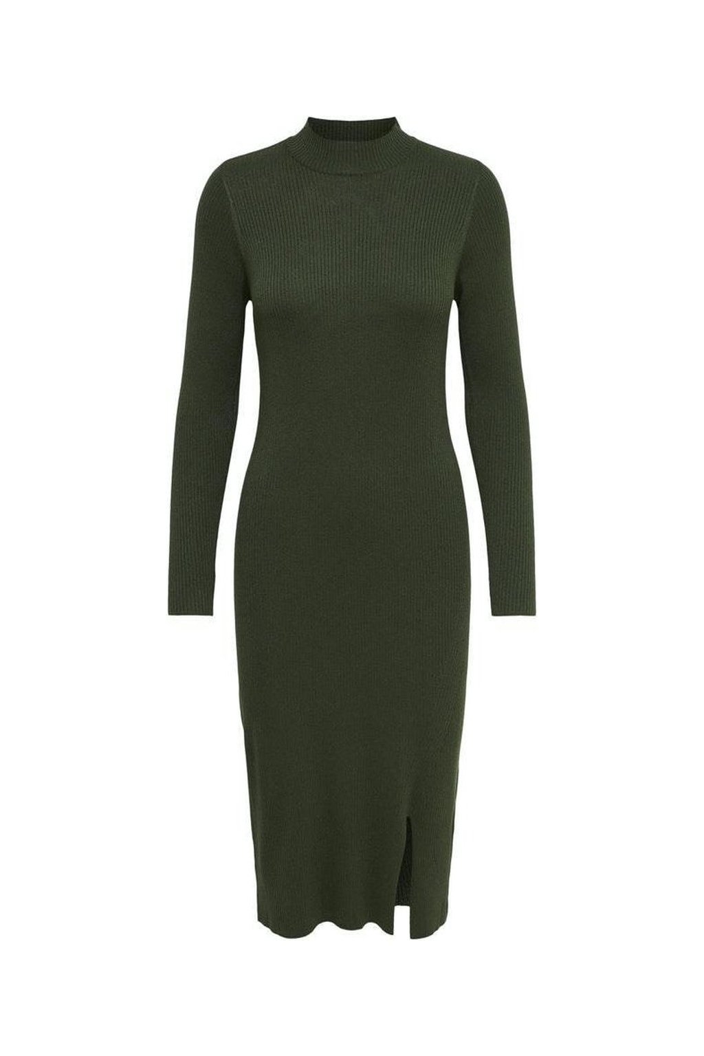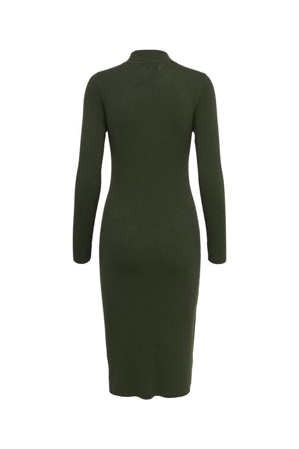 Elegantní, pohodlné a nadčasové – přesně takové jsou tyto přiléhavé šaty v trendy barvě forest night. Díky žebrovanému úpletu krásně obepnou postavu a podtrhnou ženské křivky, zatímco stojáček a dlouhé rukávy dodávají outfitu stylovou střídmost.