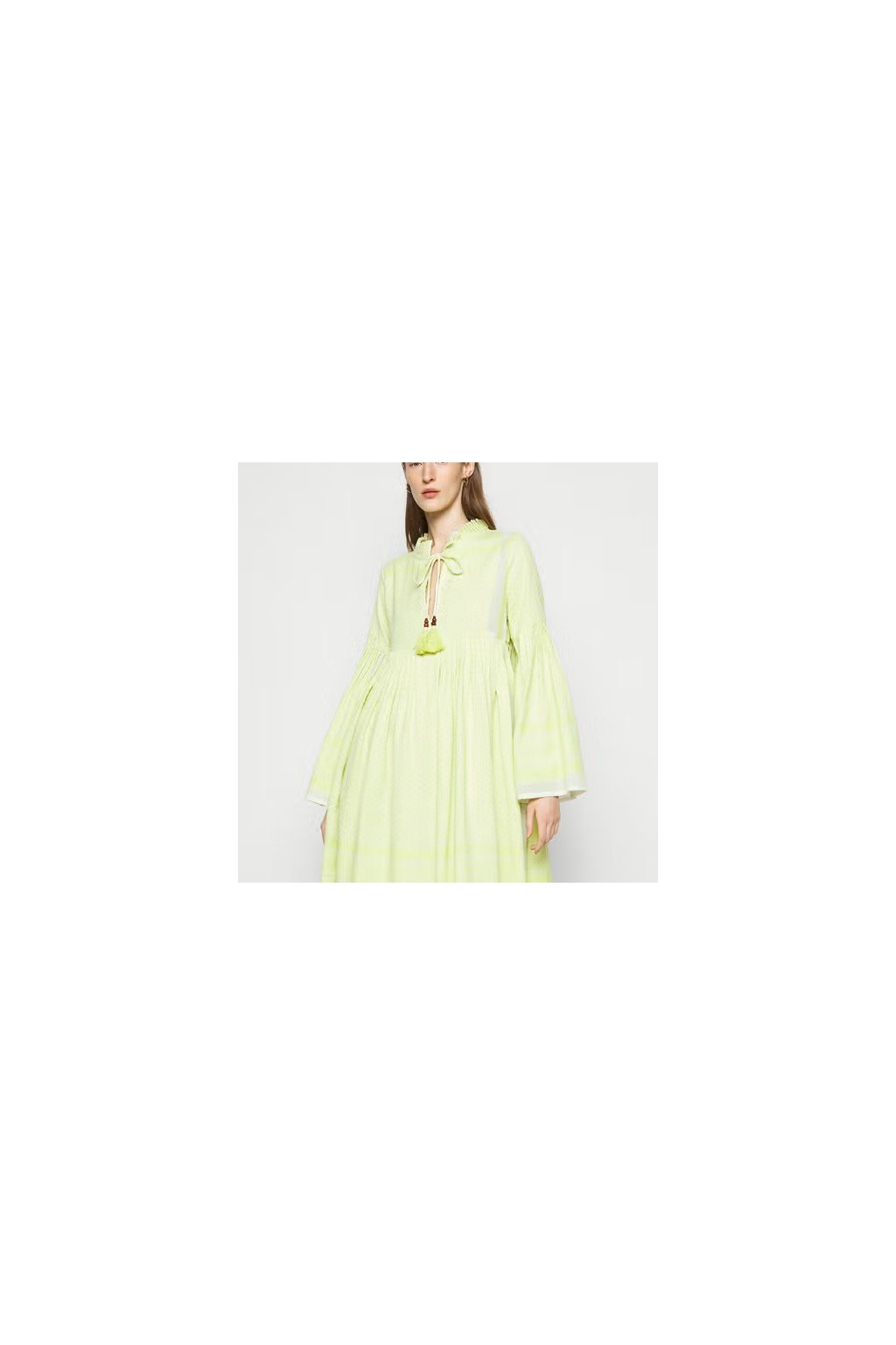 Šaty mají volný střih s výraznými nabíranými rukávy a decentními detaily na límci, které dodávají celkovému vzhledu šmrnc. Vpředu je rozparek s tkaničkami zakončenými třásněmi, které umožňují variabilní zavazování. Ideální volba pro letní dny nebo pohodové večery.