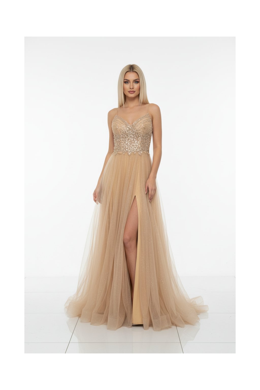 Plesové maxi šaty značky Pretty Women model Emily ve zlaté barvě
