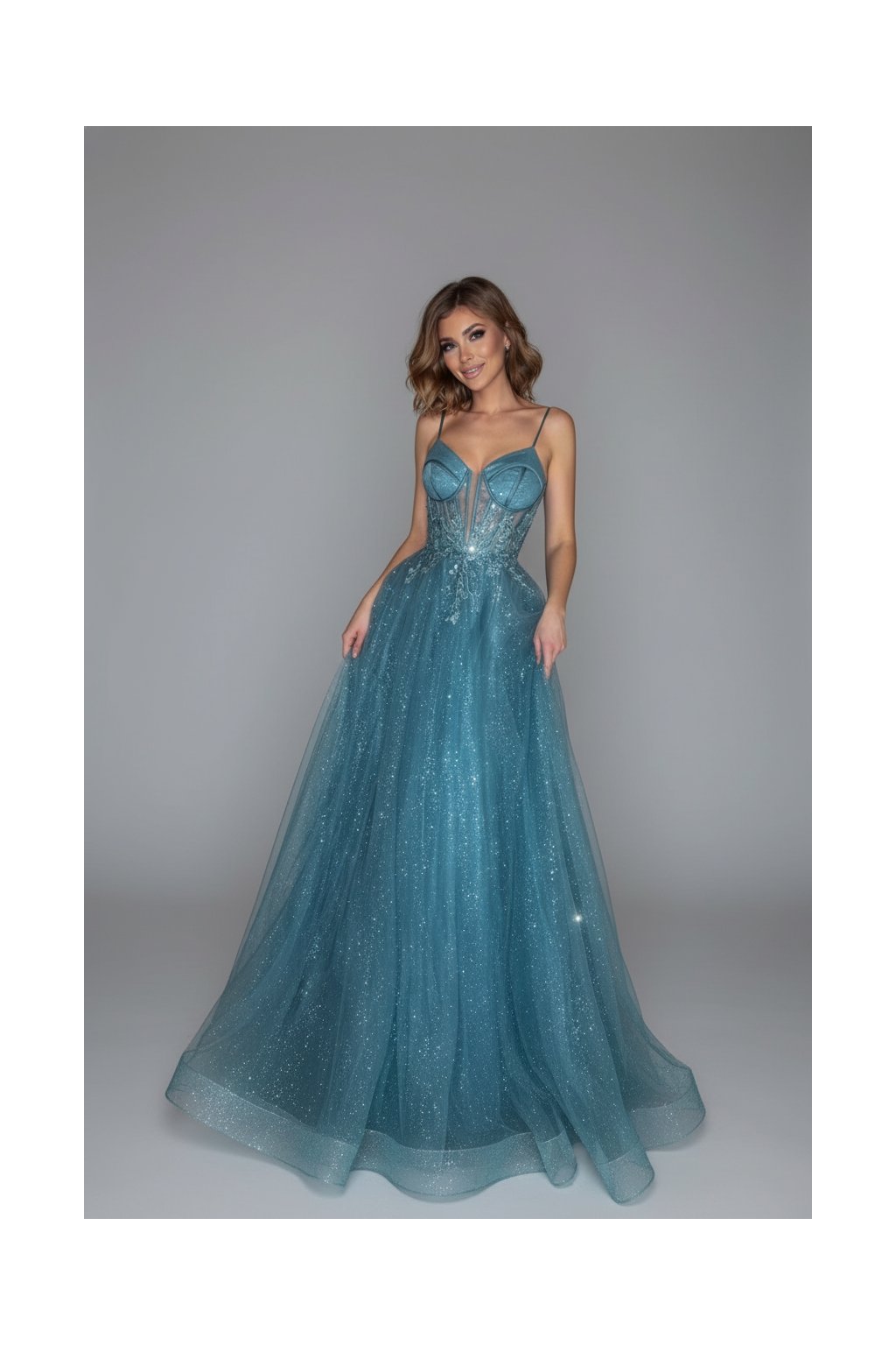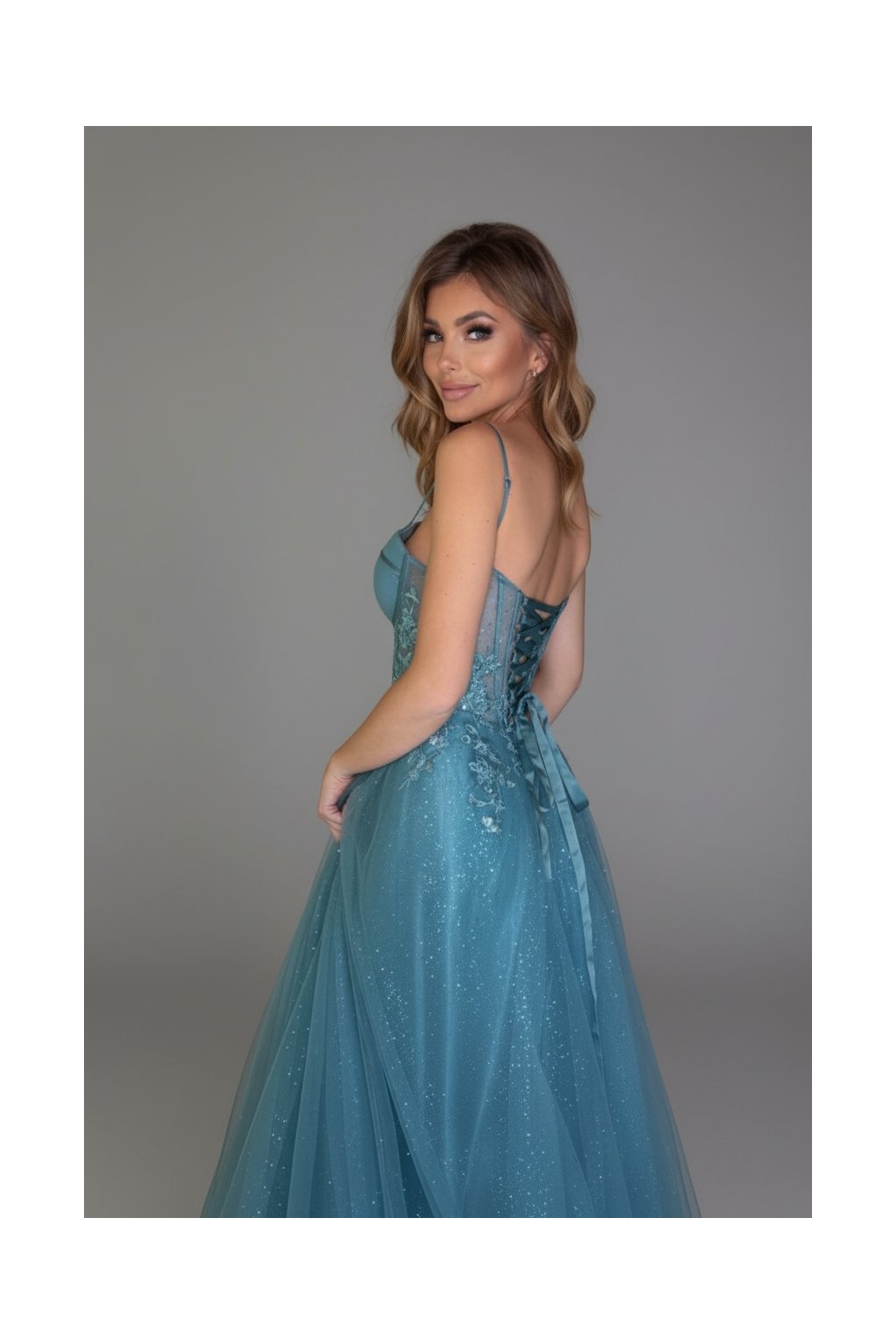- Krásný odstín modré, který zvýrazní opálení, vypasovaný korzet, který zvýrazní postavu, nádherné křišťálové ozdoby, které ji rozzáří.
