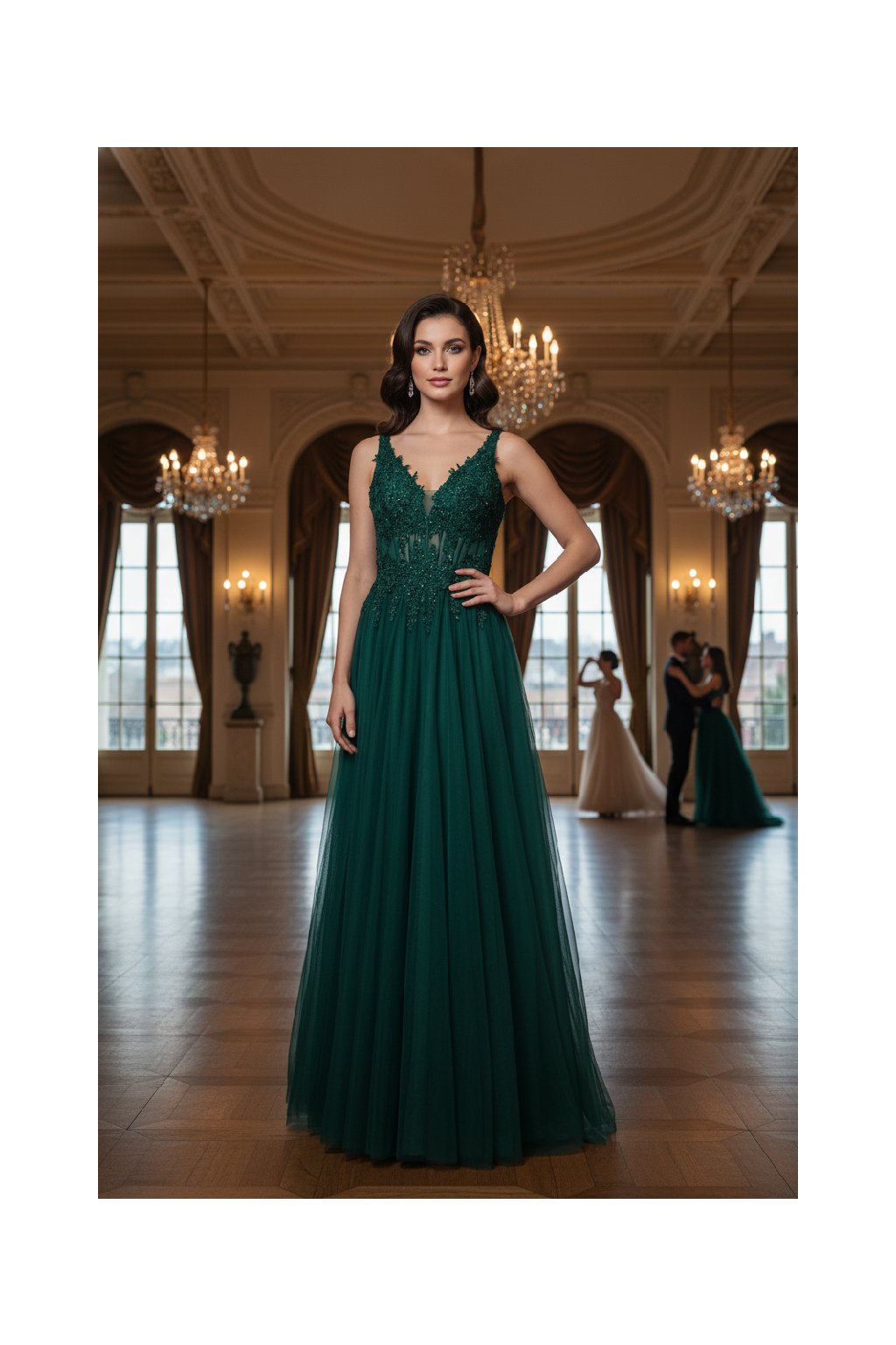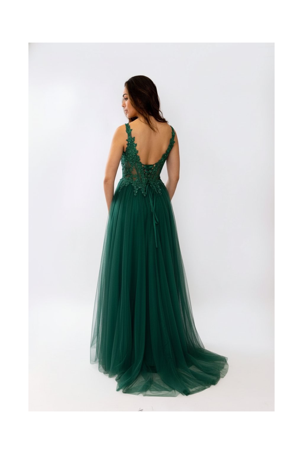Korzetový živůtek zdobený krajkou a jemnými flitry krásně zvýrazní postavu, zatímco lehká tylová sukně s rozparkem působí vzdušně a romanticky. Šněrování na zádech zajistí dokonalé přizpůsobení. Tyto šaty jsou skvělou volbou na ples, svatbu či jinou slavnostní událost. Dostupné v mnoha barvách.