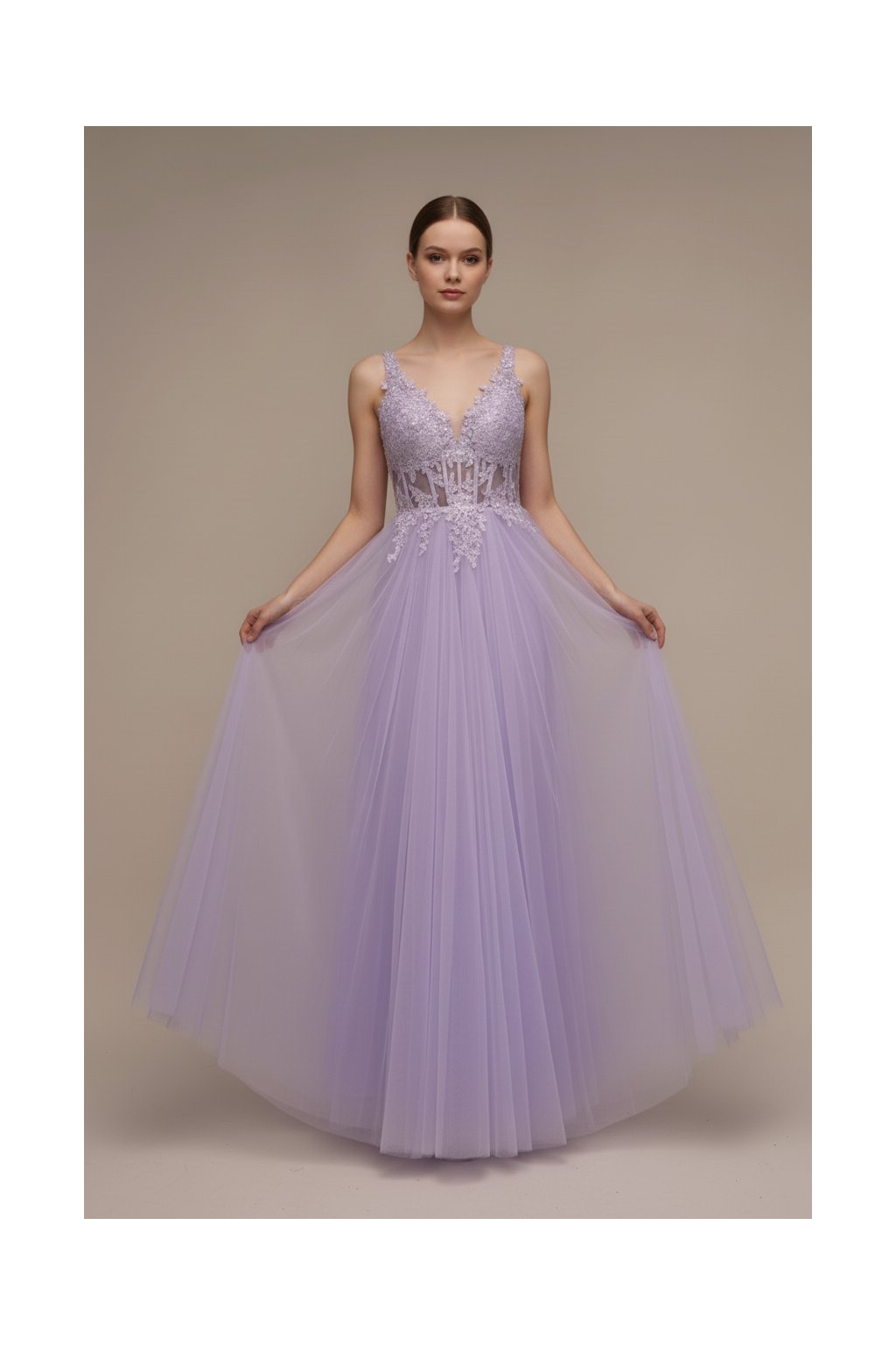 Korzetový živůtek zdobený krajkou a jemnými flitry krásně zvýrazní postavu, zatímco lehká tylová sukně s rozparkem působí vzdušně a romanticky. Šněrování na zádech zajistí dokonalé přizpůsobení. Tyto šaty jsou skvělou volbou na ples, svatbu či jinou slavnostní událost. Dostupné v mnoha barvách.