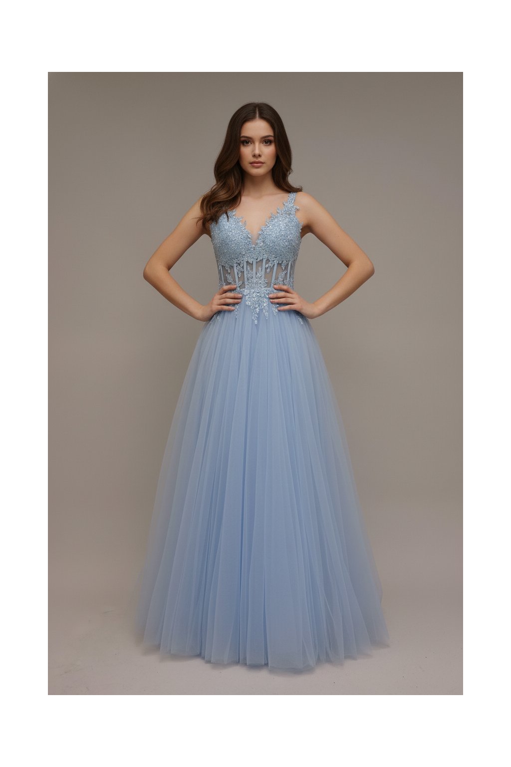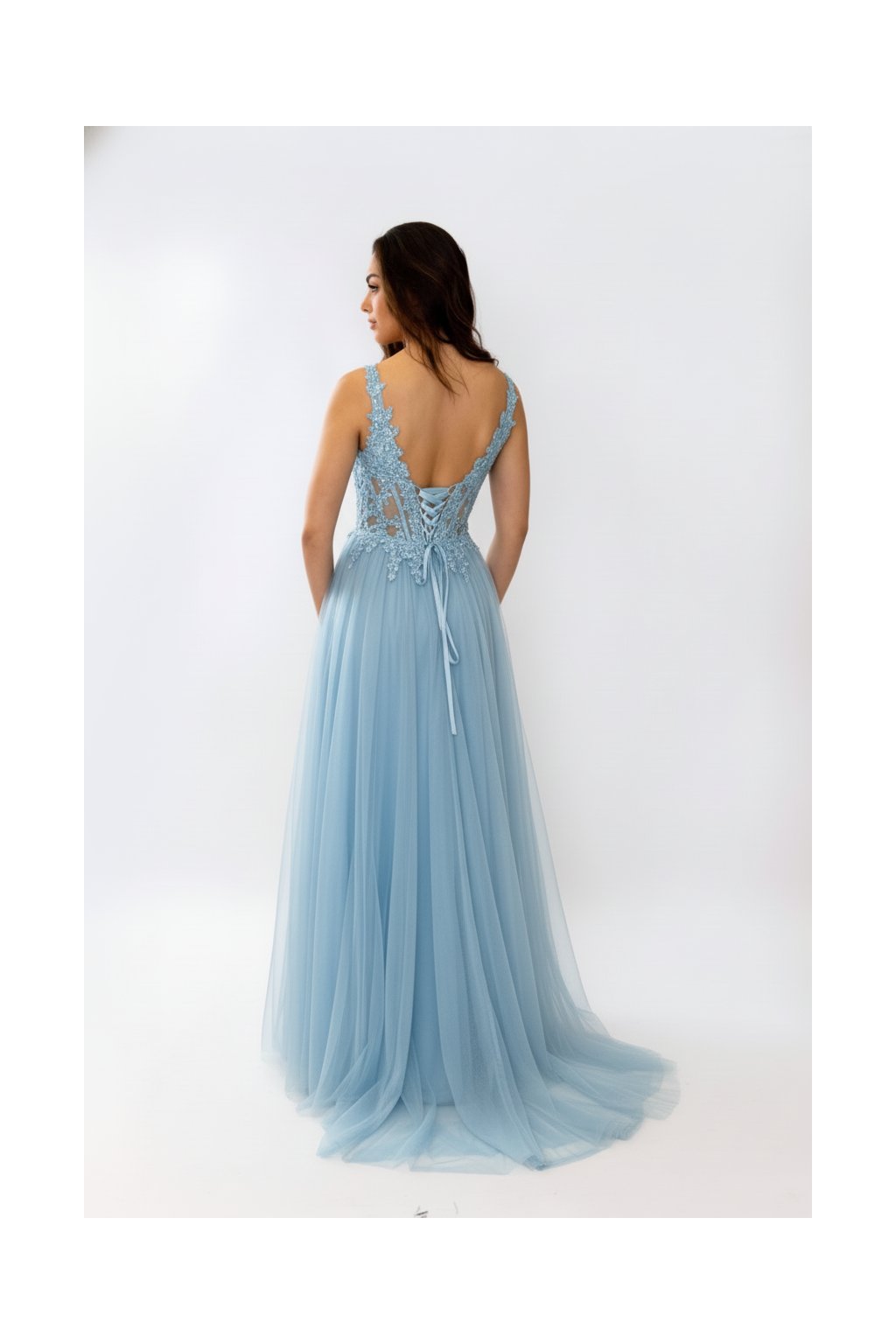 Korzetový živůtek zdobený krajkou a jemnými flitry krásně zvýrazní postavu, zatímco lehká tylová sukně s rozparkem působí vzdušně a romanticky. Šněrování na zádech zajistí dokonalé přizpůsobení. Tyto šaty jsou skvělou volbou na ples, svatbu či jinou slavnostní událost. Dostupné v mnoha barvách.